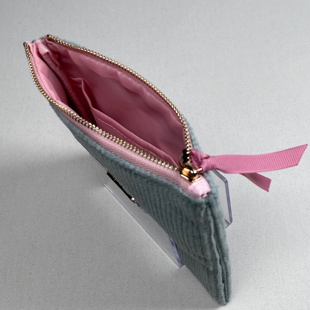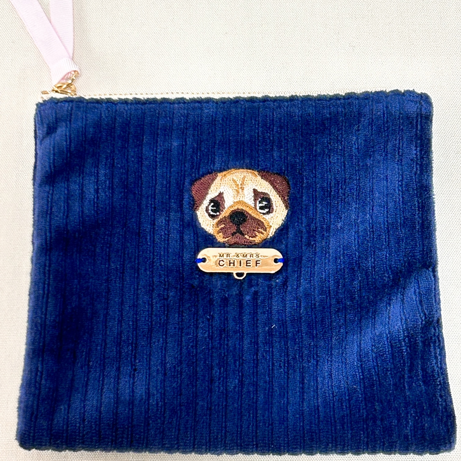 色の可愛いコーデユロイ生地にINUの刺繍をあしらった「INU POUCH」。ちょっとした小物入れに最適です。プレートやファスナー部にチャームをつければご自分だけの仕様に。
