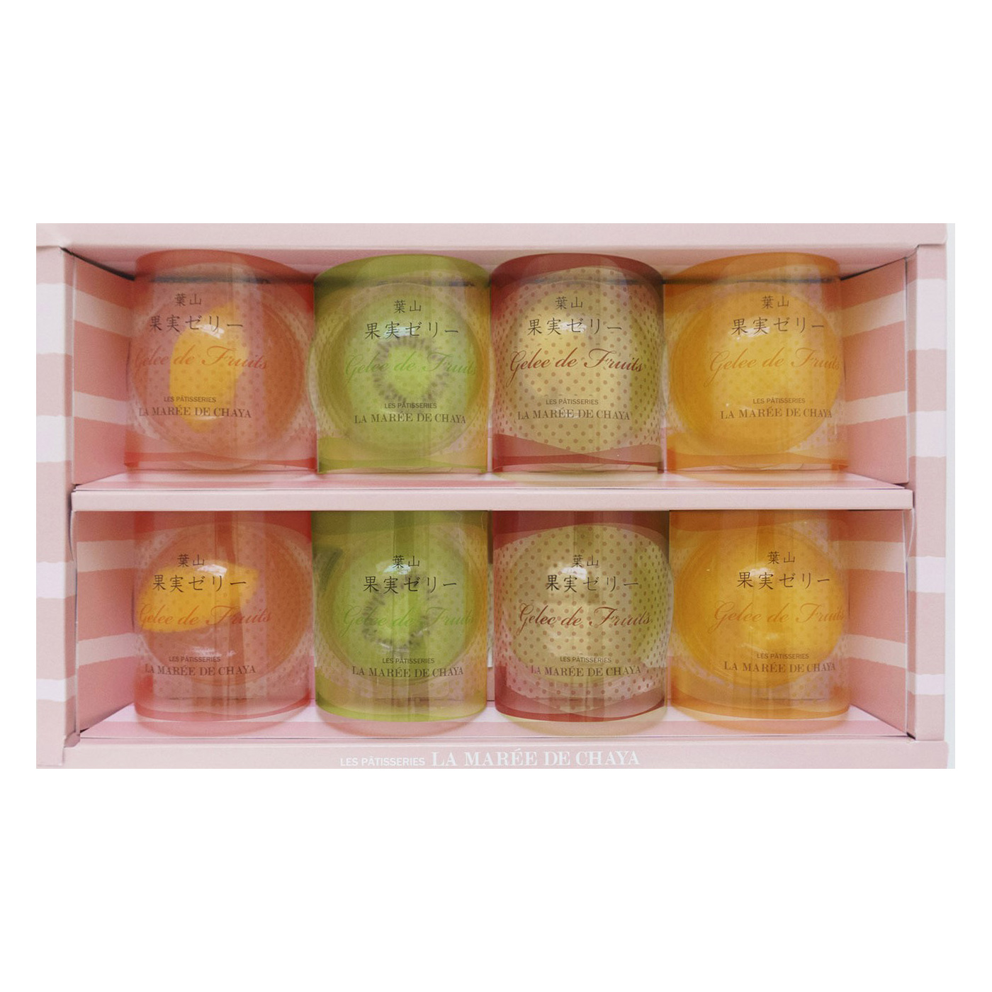 ラ・マーレ・ド・チャヤの果実ゼリー<8個入>は、二層のゼリーが異なるフルーツの豊かな味わいを重ね合わせ、色とりどりの果実の組み合わせが目と舌を楽しませます。神奈川・葉山の老舗の味を、アルコールフリーでお子様にも安心してお楽しみいただけます。