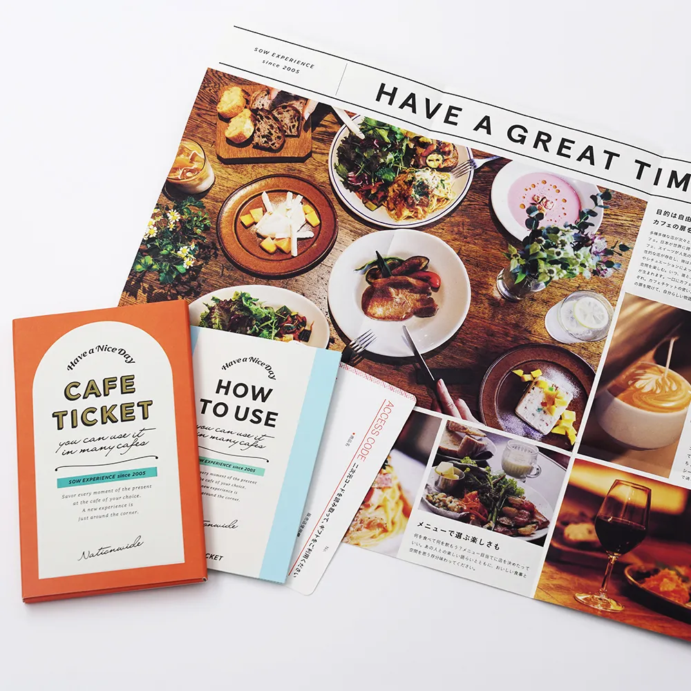 カフェへの扉をイメージしたパッケージ。チケットに加えて、カフェへ行く楽しみを伝えるイメージペーパー、使い方ガイドが入っています。 ご両親の結婚祝いや誕生日、バレンタイン、ホワイトデー、引出物など様々なシーンにおすすめです。