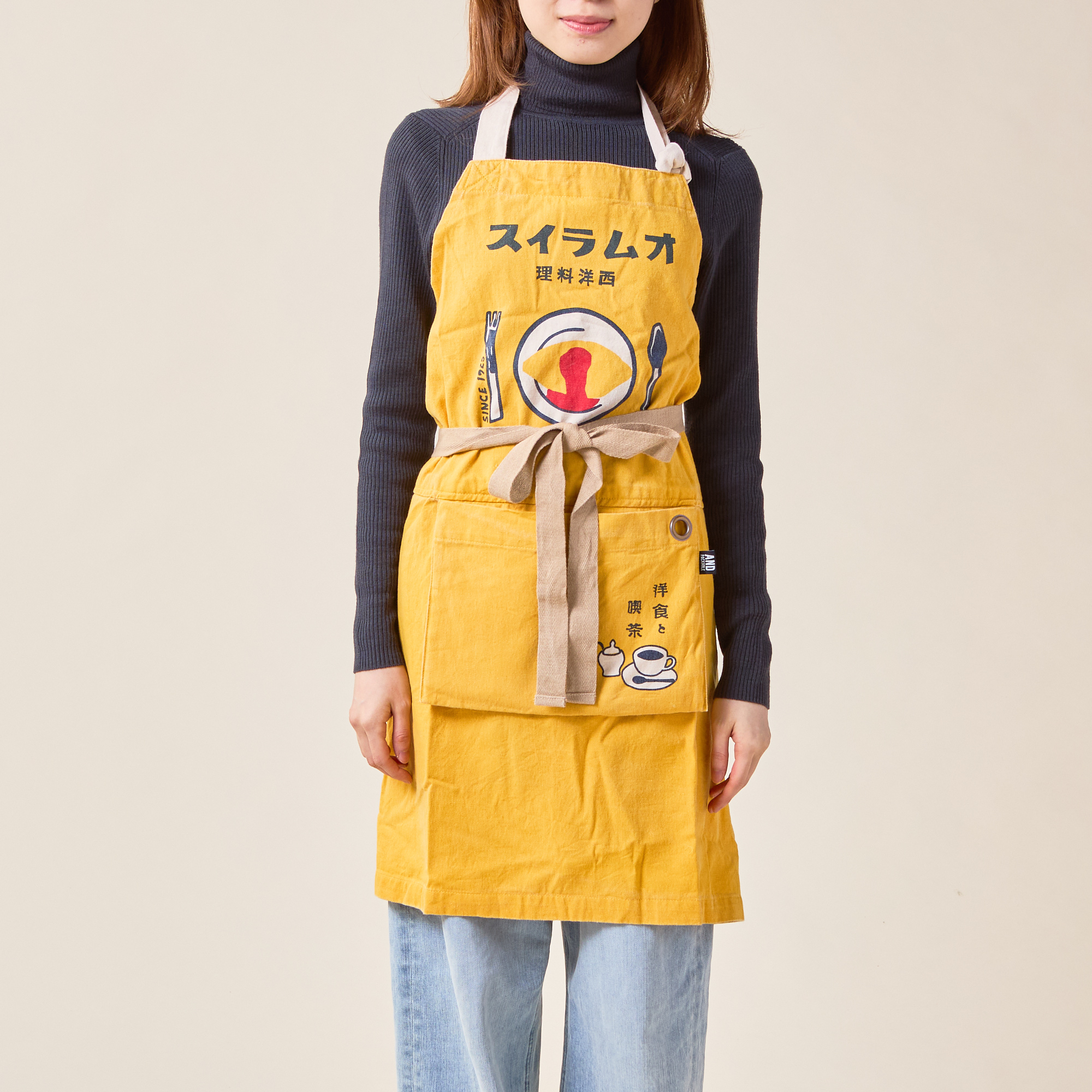 男女問わず使えるサイズ感と、レトロなイラストが特徴の首掛けエプロンは、プレゼントにも喜ばれること間違いなし。綿100%の生地は肌触りが良く、長時間の使用でも快適。 腰ひもは前でも後ろでも結べるため、使用者の好みに合わせてアレンジ可能です。 「時間は有限、デザインは無限」をコンセプトに、日々の生活に彩りを加える一品をお届けします。