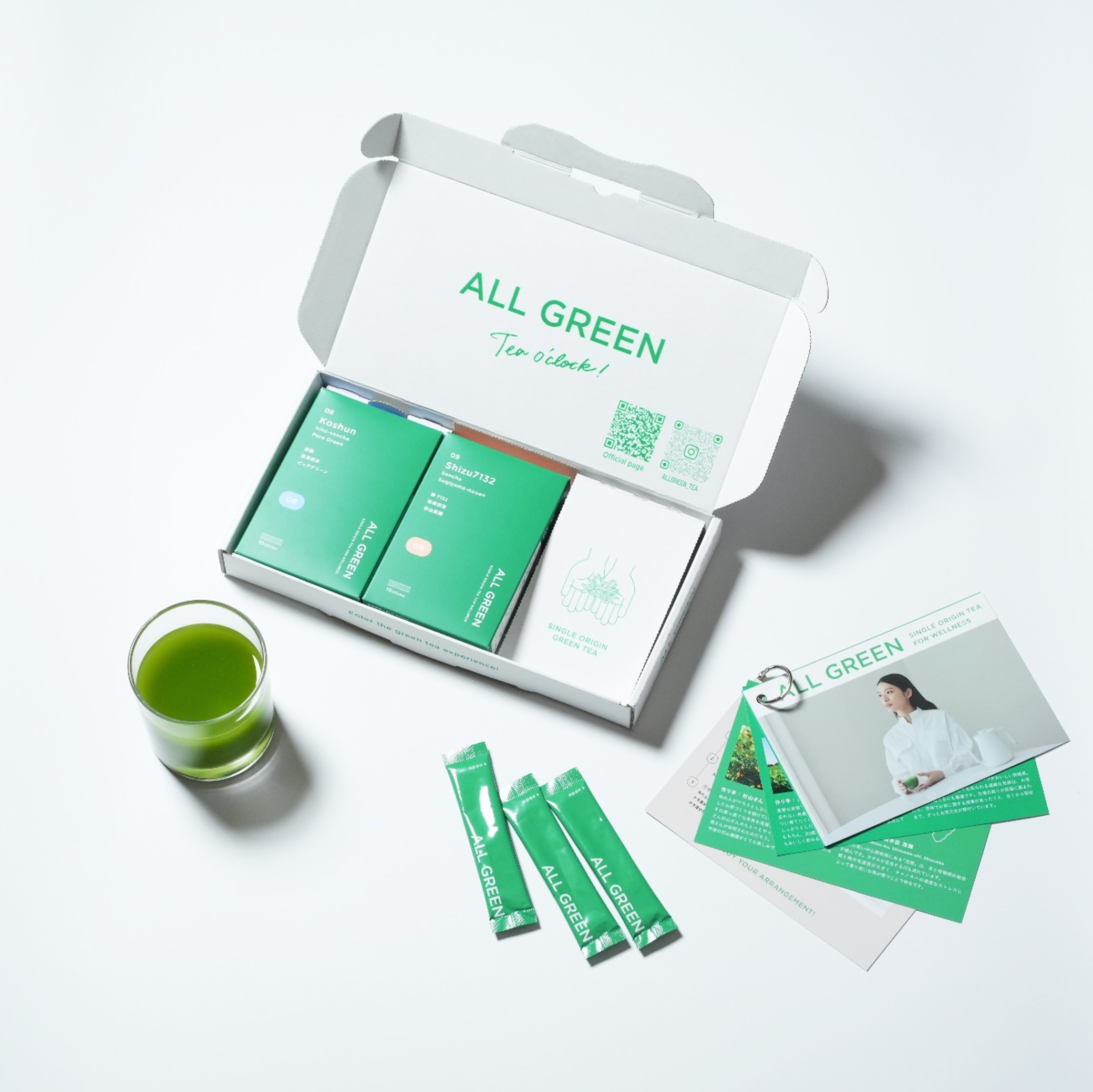緑茶を「まるごと」楽しむブランド「ALL GREEN」。全国のユニークで希少なシングルオリジン緑茶を「まるごと」粉末化。味わいの違いを楽しみながら、緑茶のもつ野菜以上の栄養も摂取できます。独自製法で水にもサッと溶けるので、どなたでも気軽にお楽しみいただけます。