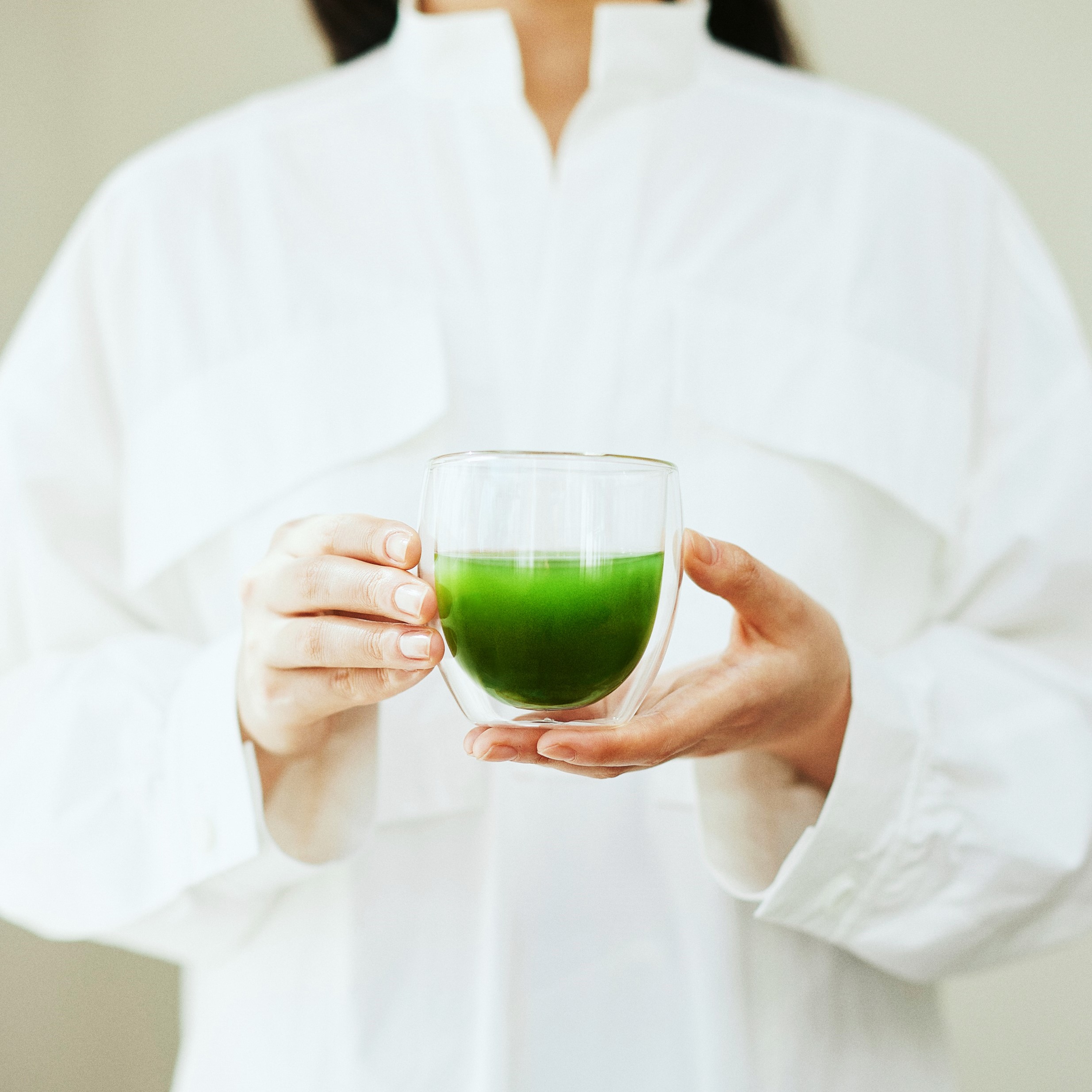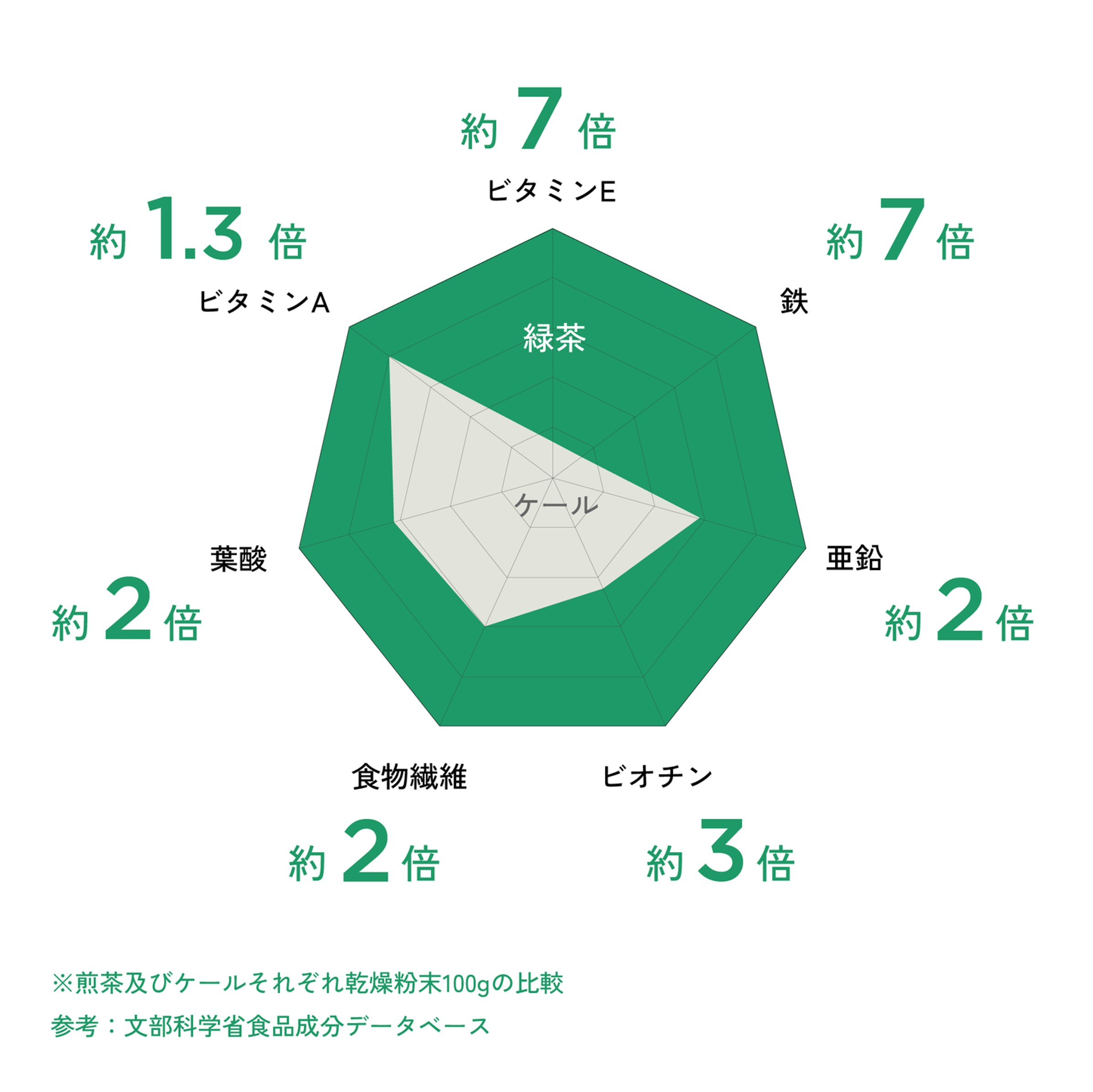 実は、緑茶には野菜の王様「ケール」以上の栄養があるんです。 そして、「カテキン」「テアニン」といった野菜にはない健康成分も含まれています。 ただし、普通に急須で淹れたお茶ではダメ。 栄養を捨てることなく摂取するためには、茶葉を丸ごと飲む必要があるのです。 普通のお茶よりもさらに栄養たっぷりな「一番茶」をまるごと粉末にしたALL GREENなら、緑茶の持つ野菜以上の栄養をあますことなく摂取することができます!