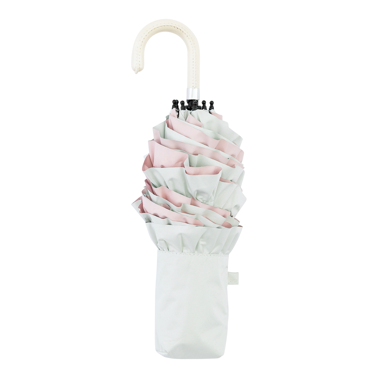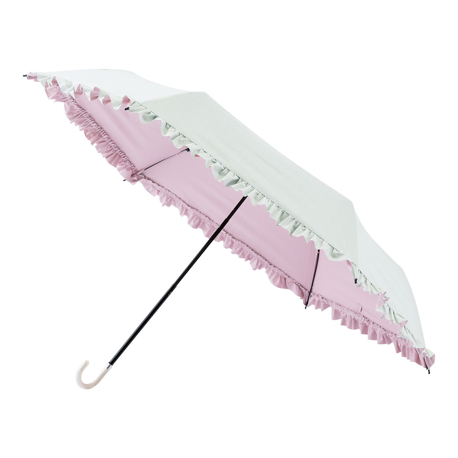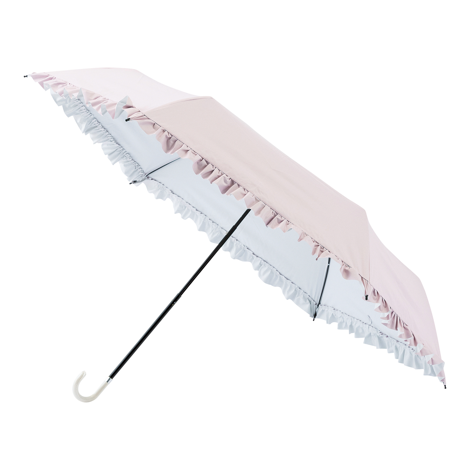 可愛らしいフリルのデザインが特徴の晴雨兼用パラソルです。シンプルなフリル仕上げと内側のカラーラミネーションが顔映りを明るくきれいに見せます。