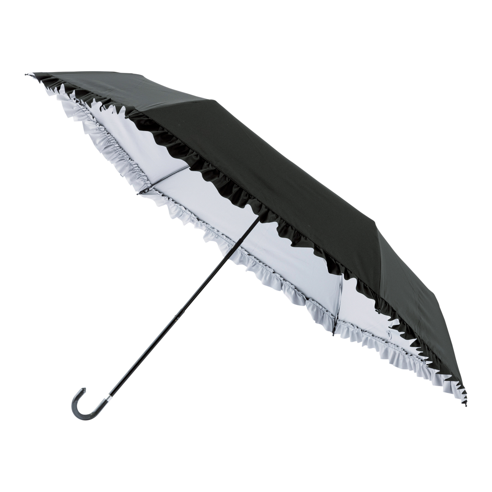 大口注文・法人のお問い合わせはこちら可愛らしいフリルのデザインが特徴の晴雨兼用パラソルです。 UVカット率100%、遮光率100%の機能性ももつ生地を使用しており、暑さ対策にも最適です。折りたたみ仕様なので持ち運びも便利です。 シンプルなフリル仕上げと内側のカラーラミネーションが顔映りを明るくきれいに見せます。