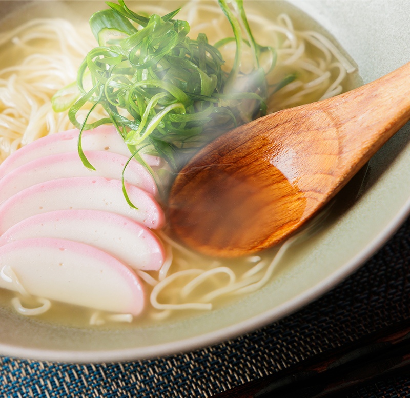 旨出汁にゅうめんは、讃岐うどんの祖先とも言われる「小豆島そうめん」を使用。瀬戸内・小豆島に手延そうめん作りの技が伝えられたのは約400年前と言われ、小豆島の職人は素材と製法を守り続けてきました。手延そうめん作りに欠かせない寒風の吹き寄せる瀬戸内の自然に抱かれた小豆島で、ていねいに作られたそうめんです。