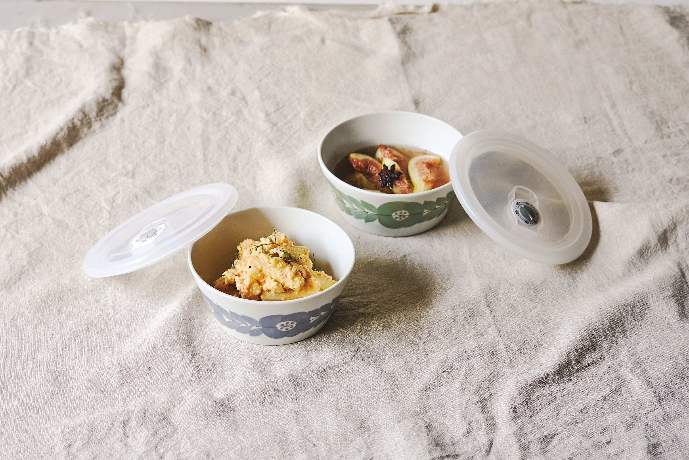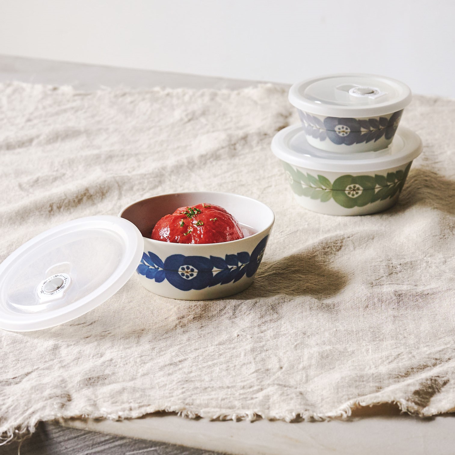 ボウル型の保存容器「ブロッサムレンジパック」は、手描き風の花柄が美しく、フタをすれば保存容器に。電子レンジと食洗機使用可能で、フタのつまみを起こせば加熱OK。目盛りダイヤルで保存日付の管理も可能です。