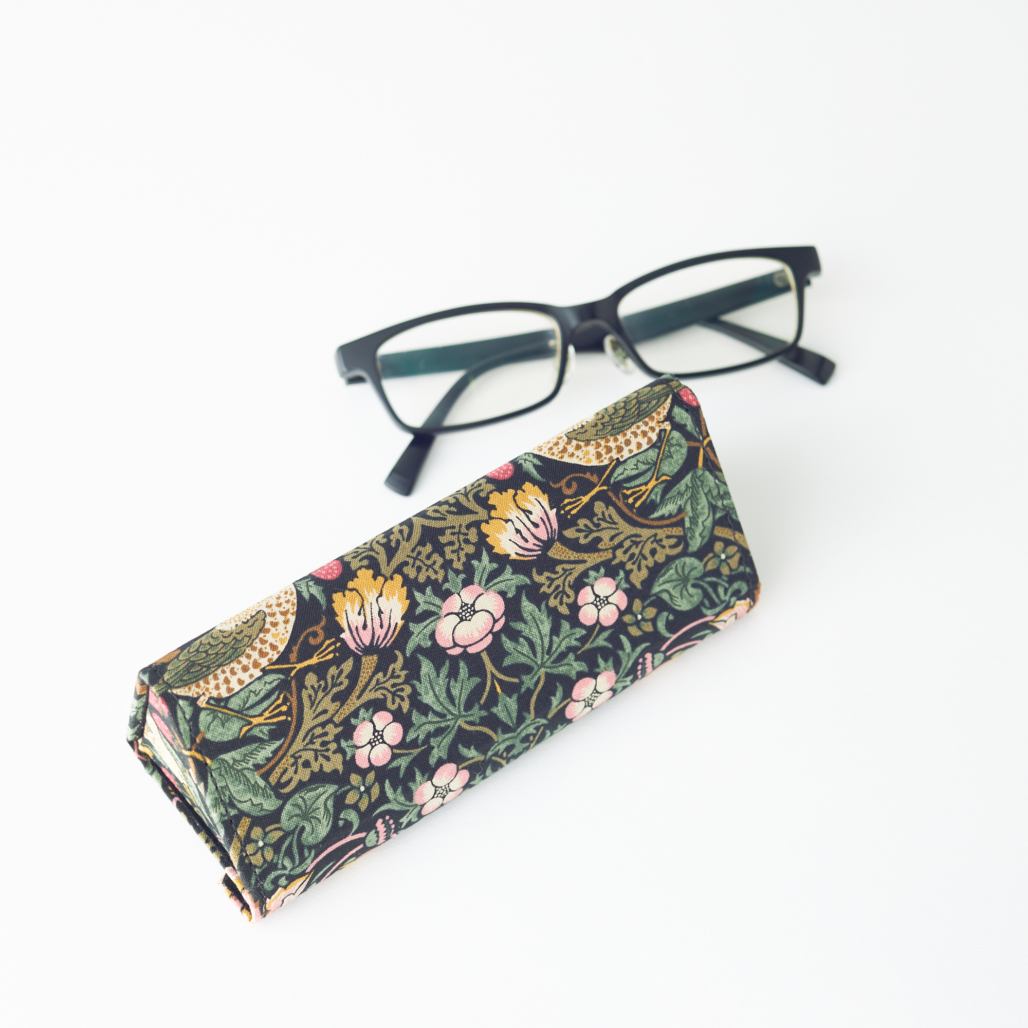 ウィリアム・モリスの数多いデザインの中でも、時代を超えて愛される「いちご泥棒」柄のメガネケースです。この柄は、モリスが庭で育てていたいちごが、ちょうど赤く色づいてきた頃、食いしん坊の小鳥たちに食べられてしまうという悩みをインスピレーションにデザインされました。