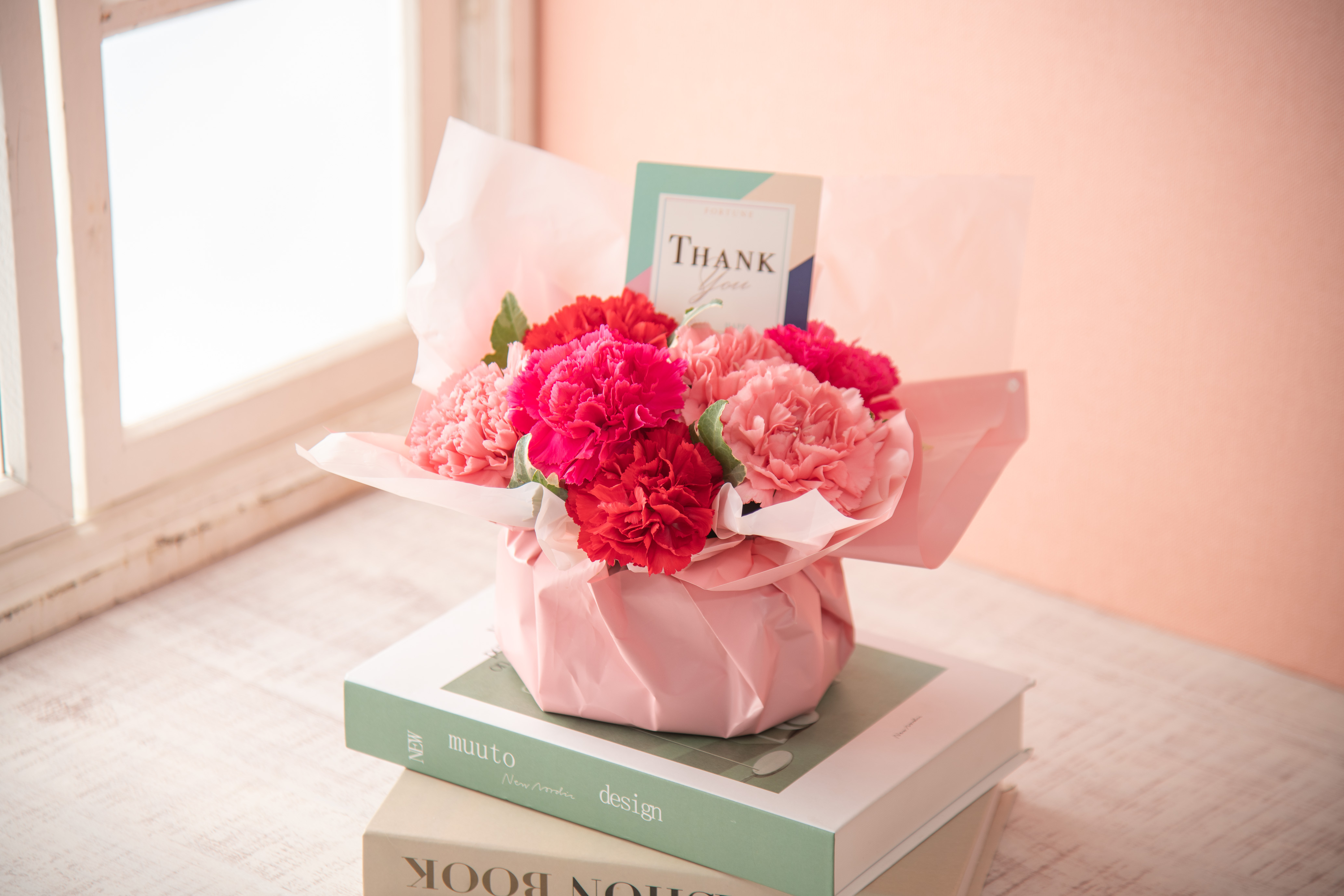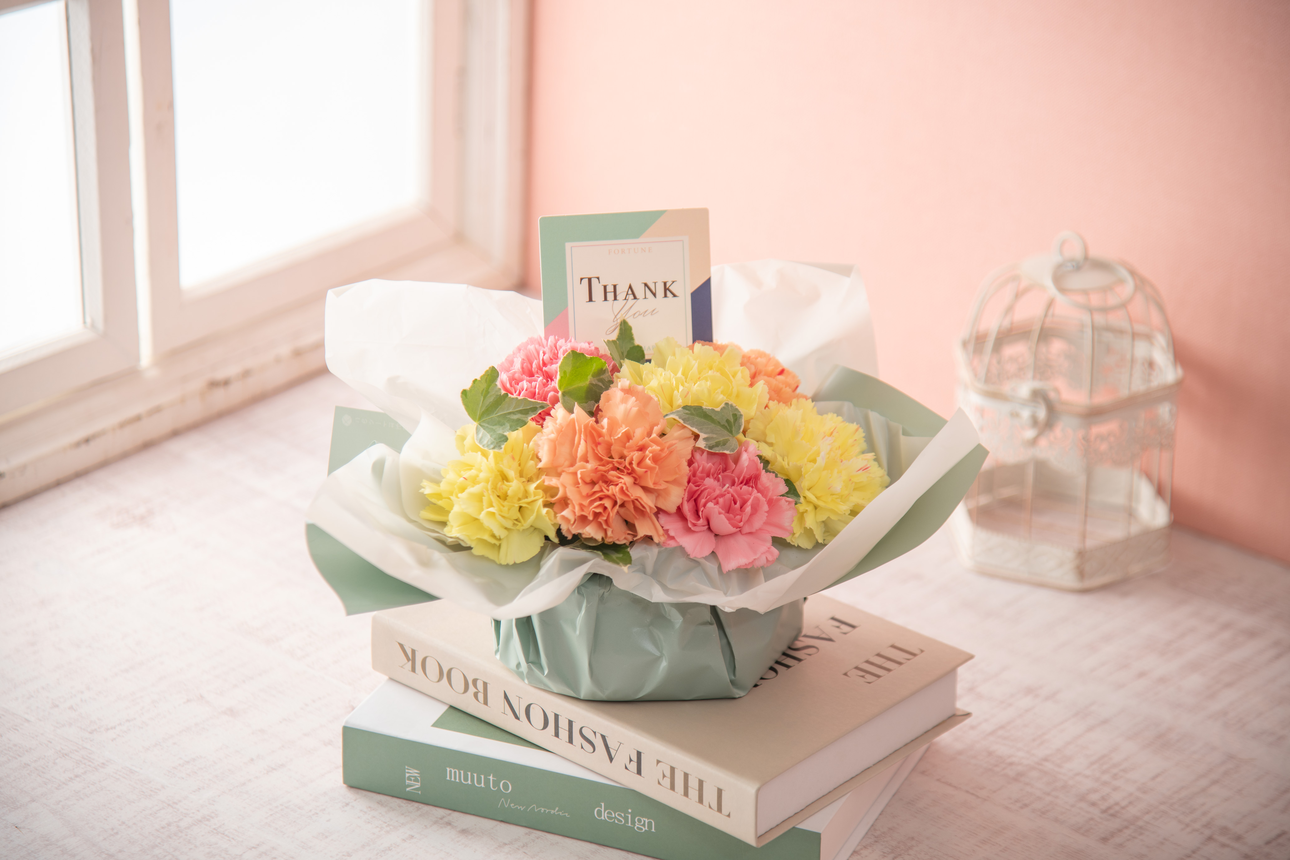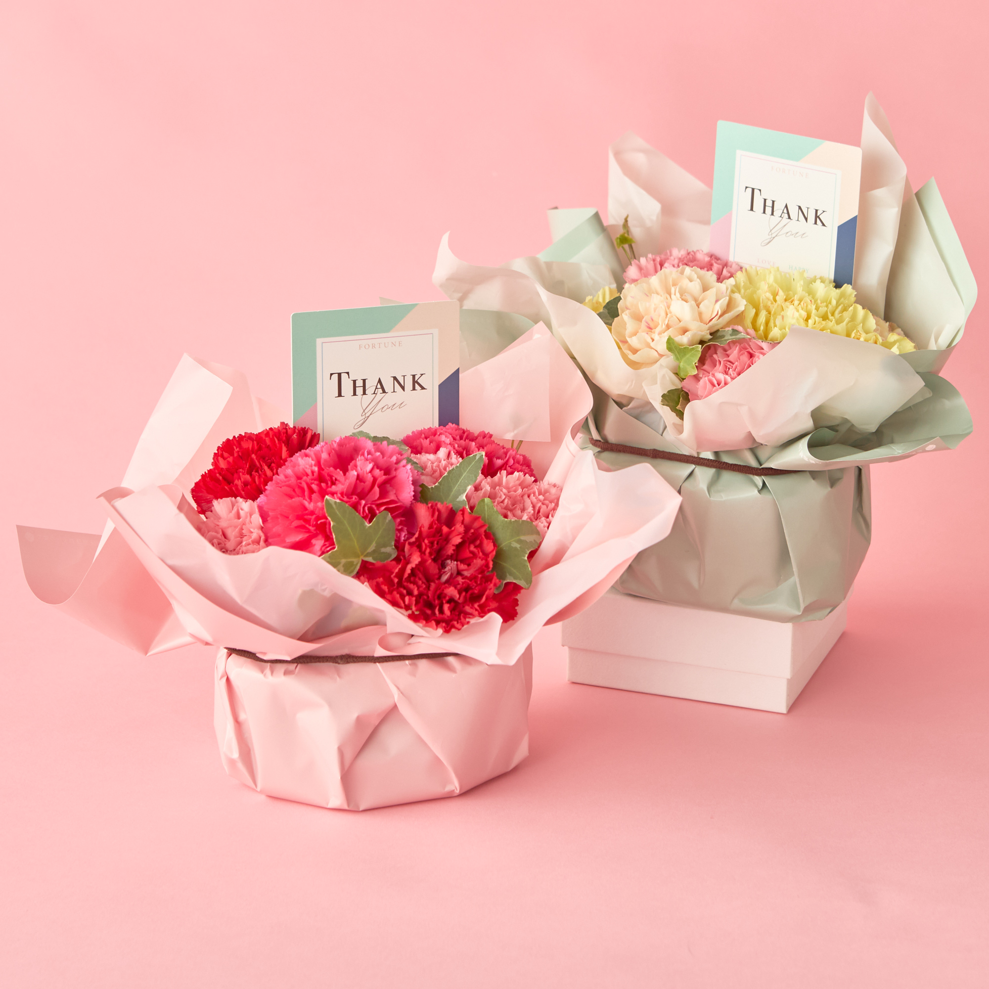 大口注文・法人のお問い合わせはこちら手軽に楽しめるフラワーアレンジメント。 カーネーションのグラデーションでお母さんへのたくさんの愛情を表しています。 THANK youピックがアクセント。 100%リサイクル素材を使用した花器も処分しやすいお手軽なアレンジメントです。 ★環境に配慮したラッピングペーパーやピック、器を使用しています。