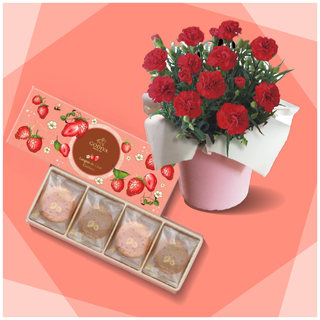 定番のオーソドックスな赤カーネーション鉢と、世界で愛されるチョコレートブランド「GODIVA(ゴディバ)」 のラングドシャクッキーのセット。「母への愛」を花言葉に持つ赤カーネーションは母の日におすすめです。