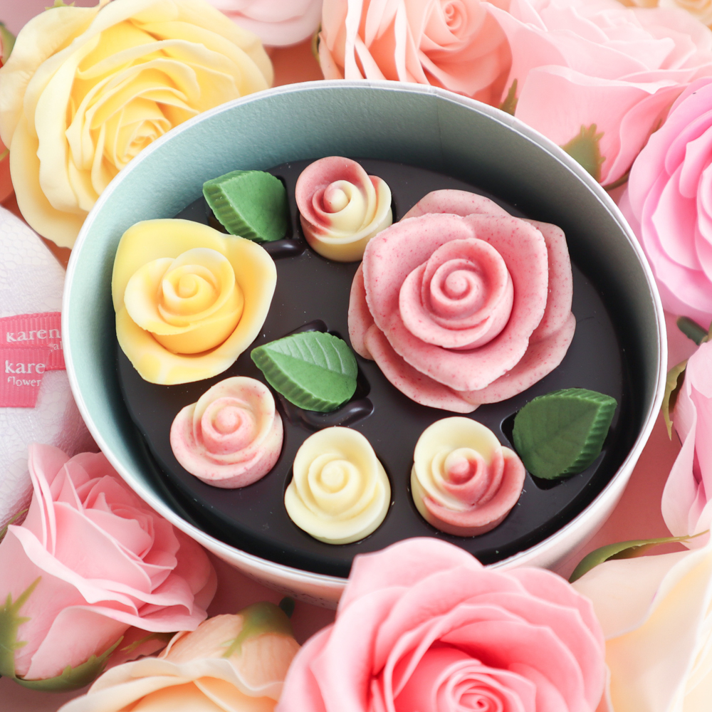 karendo×MESSAGE de ROSEのコラボで奇跡のレインボーチョコレートが完成しました。 バラの花びらを1枚1枚作り7つの色と7つの味を表現し、本物のバラのように仕立てました。 また、味にもこだわり、7つの味を楽しめるワクワクするチョコレートです。 独自の製法でフルーツそのものを配合しフルーティな味わいをとじこめ、本物の果実を食べているような味わいのチョコレートです。 『こんなの見たことない!』と驚いて笑顔になっていただける商品です。