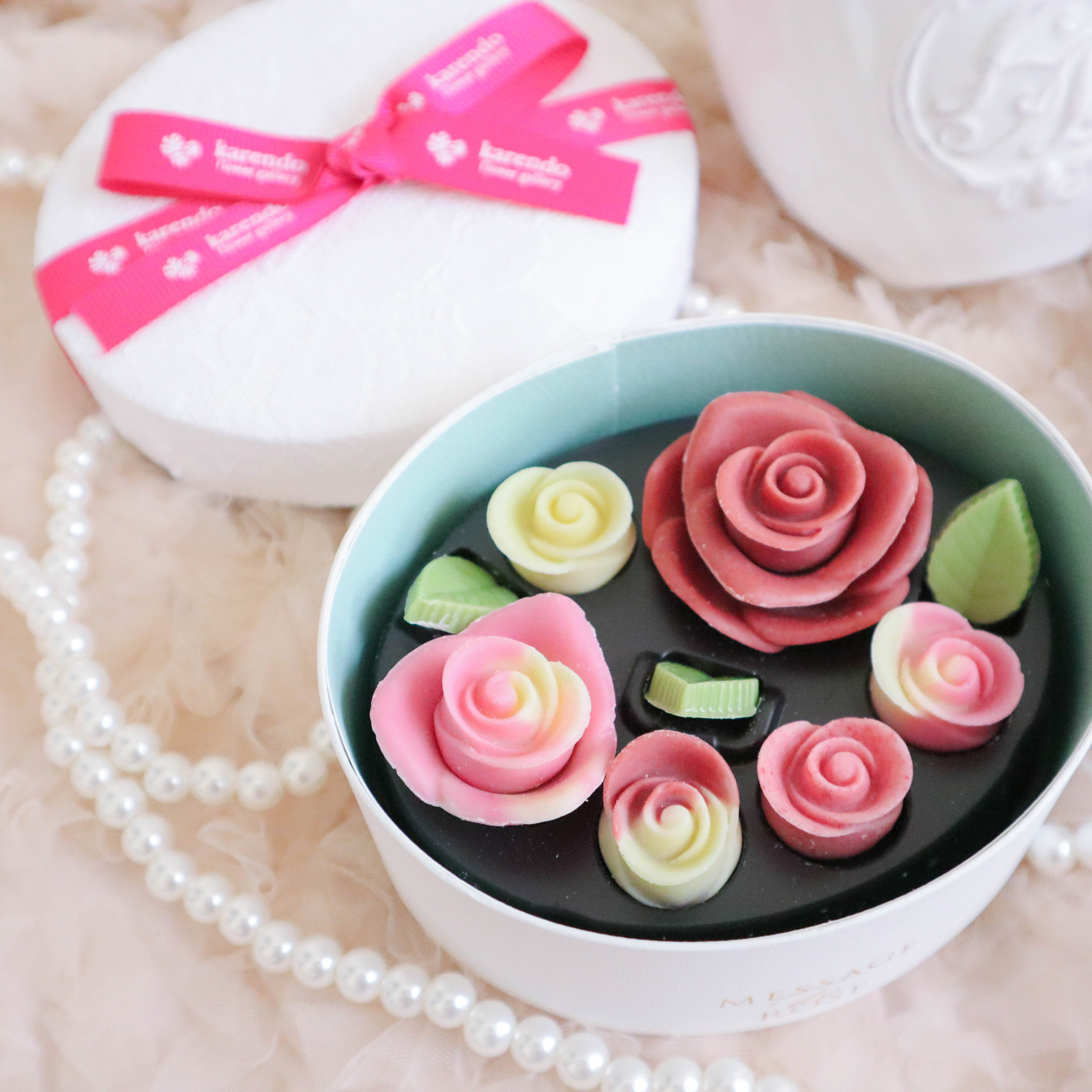「MESSAGE de ROSE」×「karendo」がコラボレーションした期間限定チョコレート! 繊細なレースのギフトボックスに、ピンクのリボンをあしらい、上品さの中に”スイートピーのお花のような優しい色合いと甘い香り”をぎゅっと詰め込んだ、誰かにプレゼントしたくなるギフトです。 繊細なレースの箱に包まれたチョコレートはまるで宝石のようです。