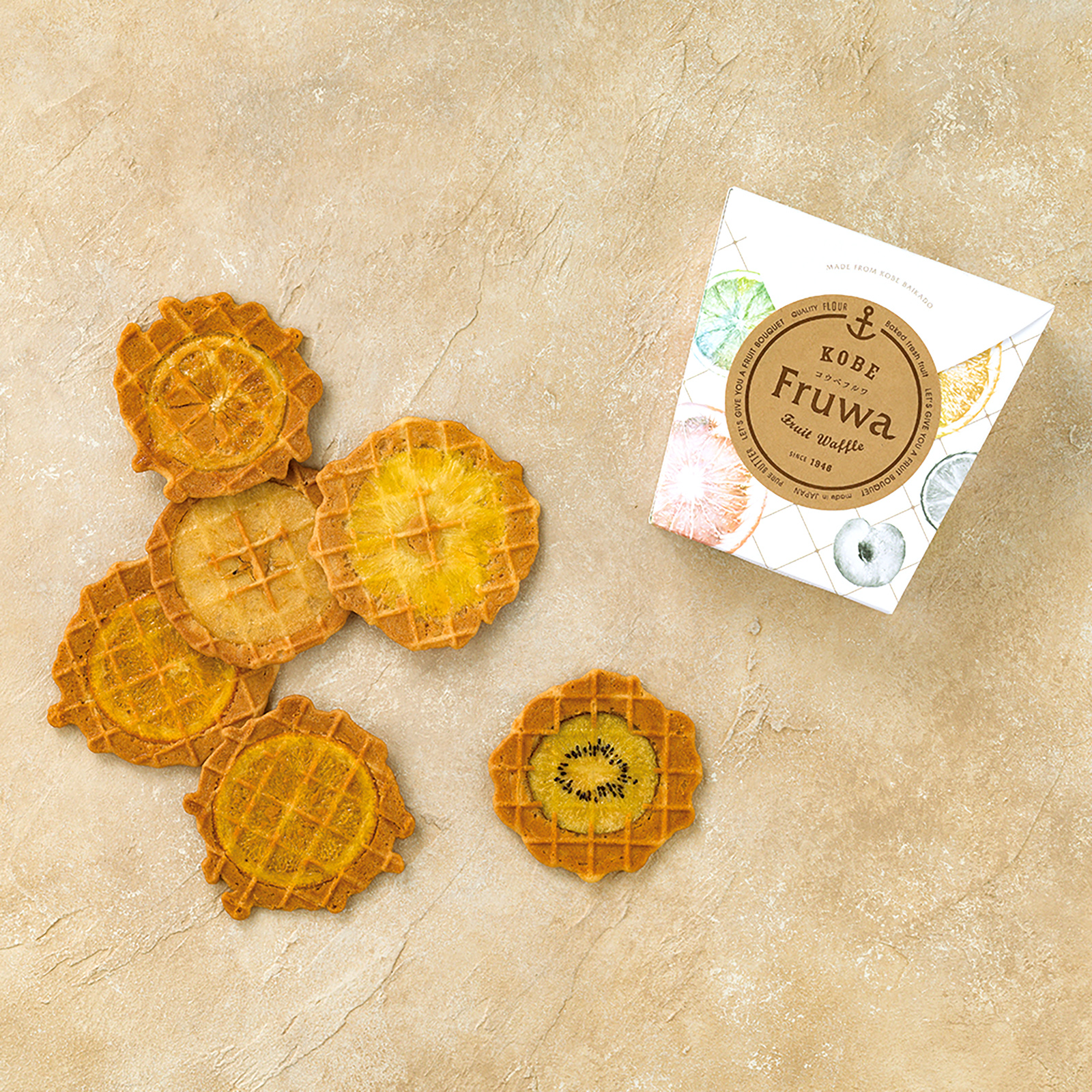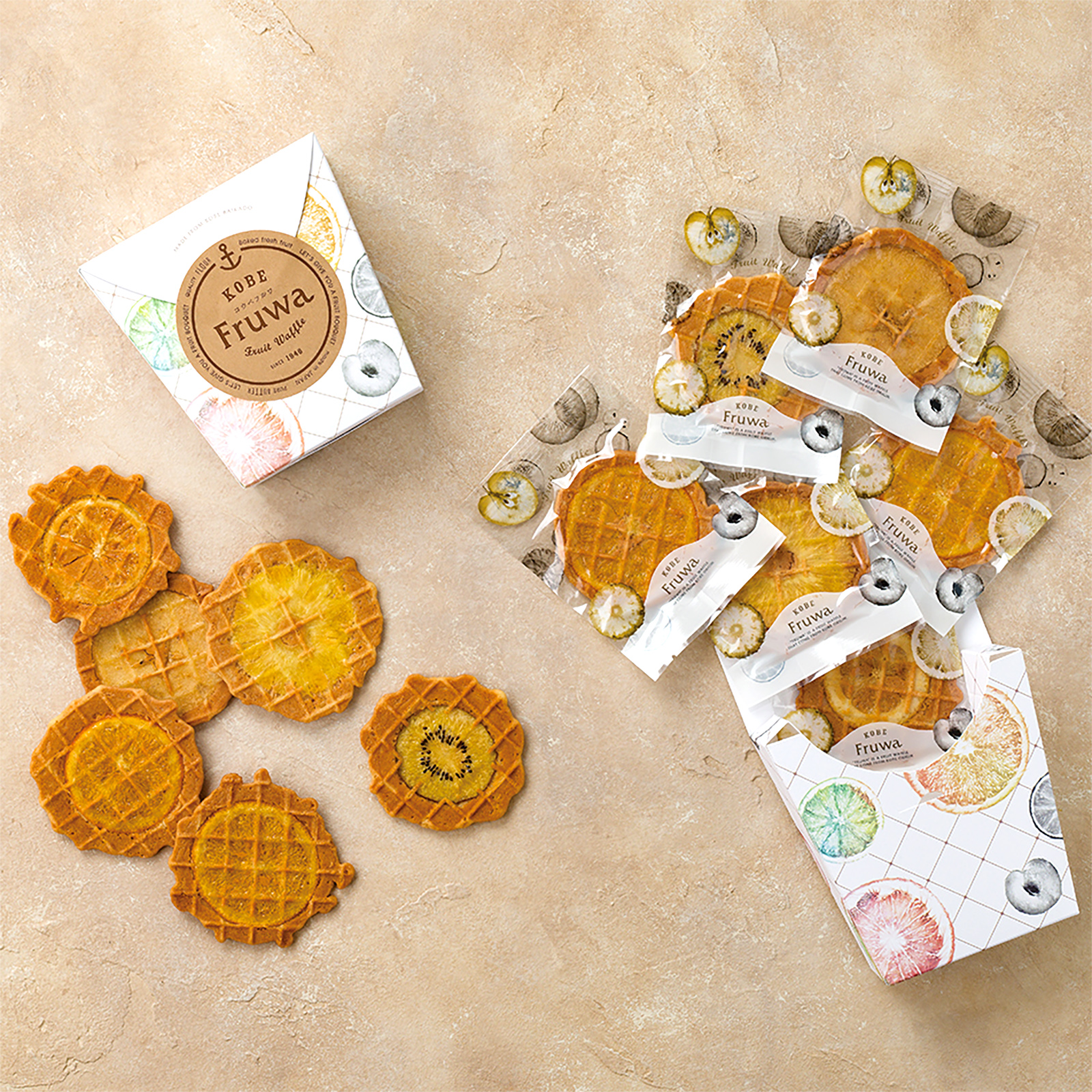 【神戸の伝統と革新が生んだ逸品】 創業昭和21年、伝統的なはさみ焼きの技術を駆使して生まれた『梅香堂』のフルーツワッフルクッキー。瓦せんべいの伝統技術と北フランス・リール地方のバタークリスプワッフルの融合により、今までにない新しい食感と風味を実現しました。色とりどりの果物を使用し、まるでフルーツで咲かせた花束のようなビジュアルが、目にも楽しい一品です。