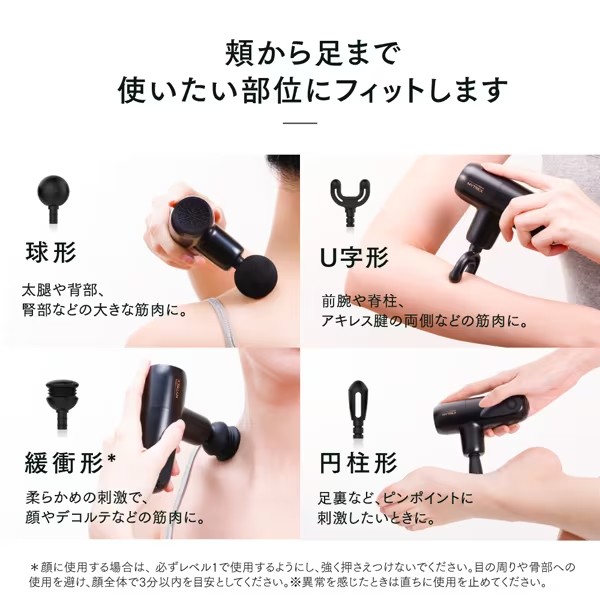 顔筋を効果的にケアし、いきいきとした明るい表情へ。 MYTREXは顔全体の印象の決め手となる「顔 筋」に着目。顔に優しいアタッチメントも標準付属しました。柔らかい特殊シリコン採用の緩衝型アタッチメントを使って、気になる顔も安全にケアできます。 ※顔に使用する場合は、必ず緩衝形アタッチメントを使用し、レベル1で肌に軽く触れる程度に当ててご使用ください。 ※目の周りや骨部への使用を避け、顔全体で3分以内を目安としてください。 ※異常を感じたときは直ちに使用を止めてください。