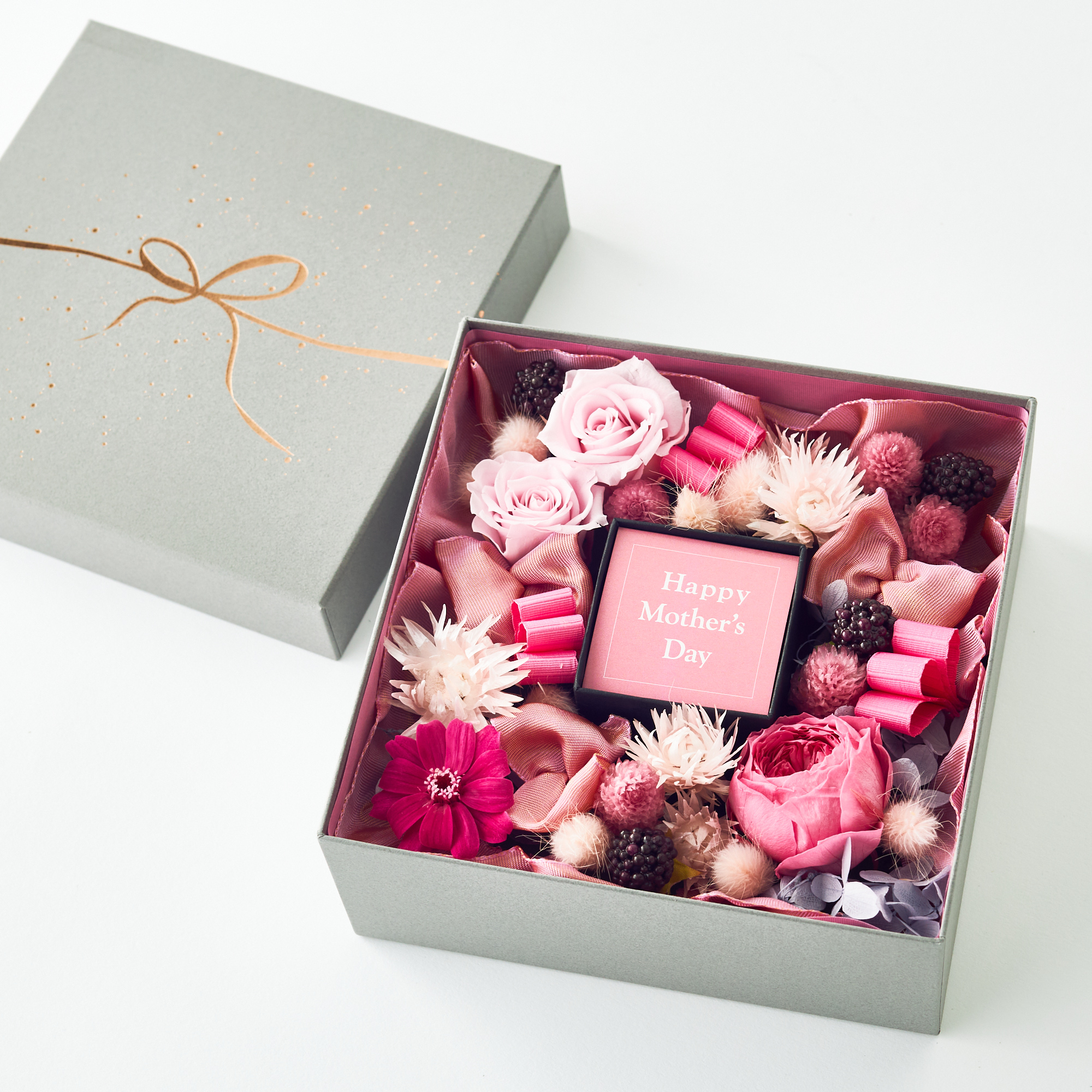 大口注文・法人のお問い合わせはこちらプリザーブドフラワーをいっぱいに装飾した華やかなスペシャルボックス。 中央に選べるメッセージ付きです。 開けたときのサプライズ感は特別なギフトにもぴったり。 母の日・誕生日・記念日などにおすすめです。