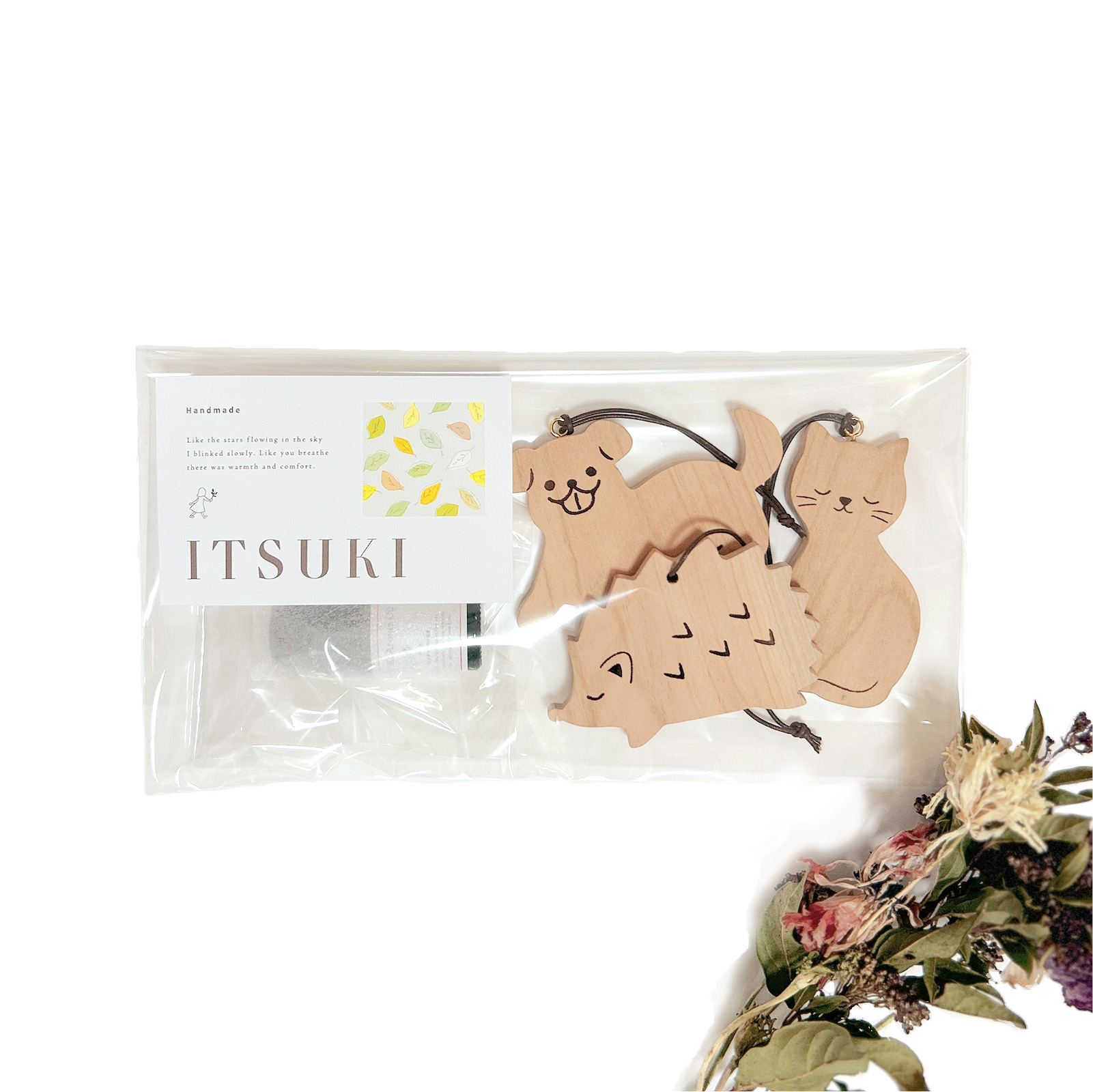 | サイズ | サシェ ・いぬ=幅9㎝、縦6㎝、高さ0.7㎝ ・ねこ=幅4㎝、縦8㎝、高さ0.7㎝ ・はりねずみ=幅8㎝、縦5㎝、高さ0.7㎝ オイル瓶=幅2.5㎝、高さ6㎝ |