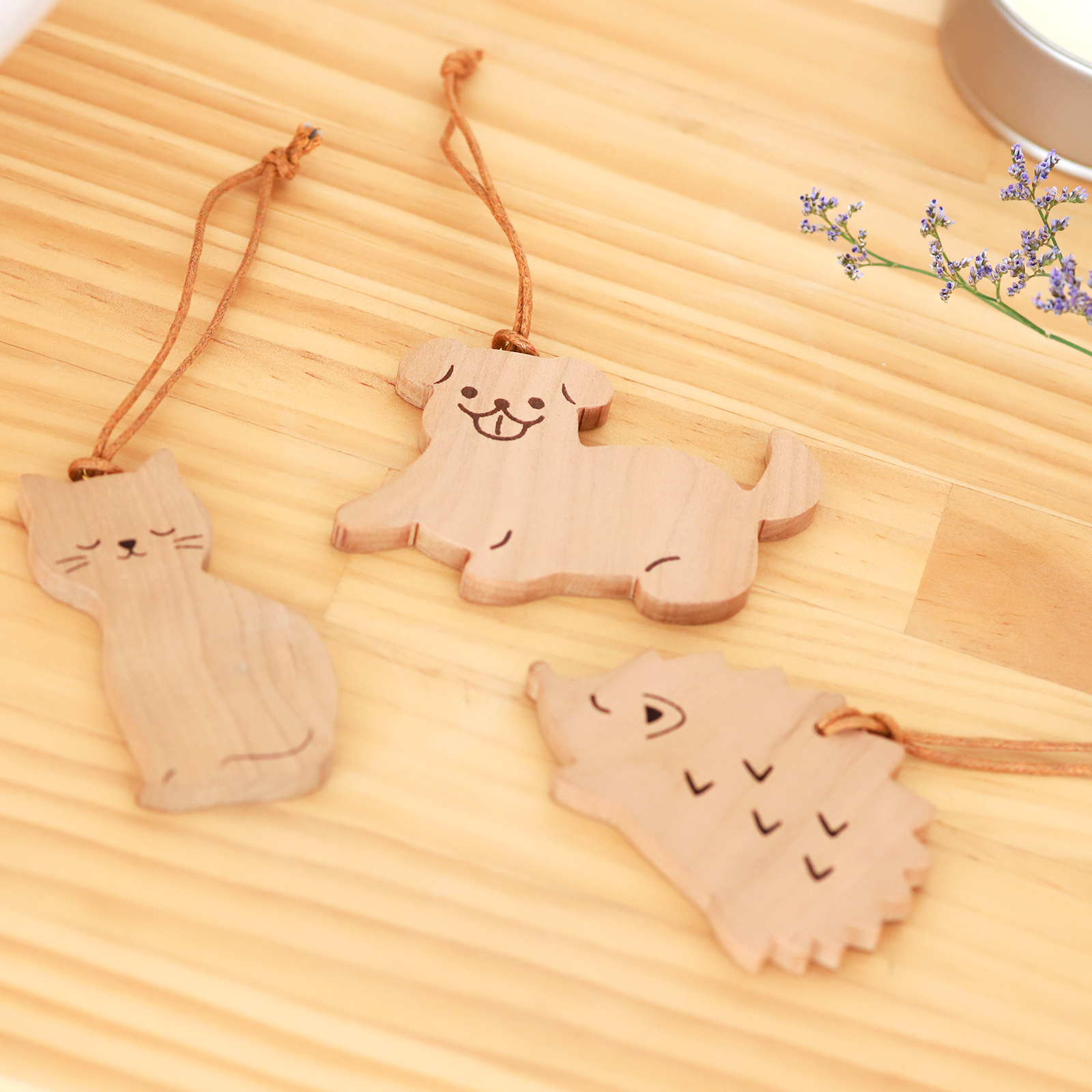 香りをしみこませ、クローゼットやドアノブに吊るしたり、シューズボックスや玄関などに置いたりしてふんわりとした香りを楽しめます。 香りが弱くなったなと感じたら、オイルを再度つけてください。 また、お手持ちのひのき以外のアロマオイルもご使用が可能です。 ※付属の紐は取り外し可能です。 ※使用回数を重ねると、アロマのシミが発生いたします。ご理解いただきますようお願いいたします。 動物好きにはたまらない愛らしいプレートは、いぬ、ねこ、はりねずみの3種類入り。