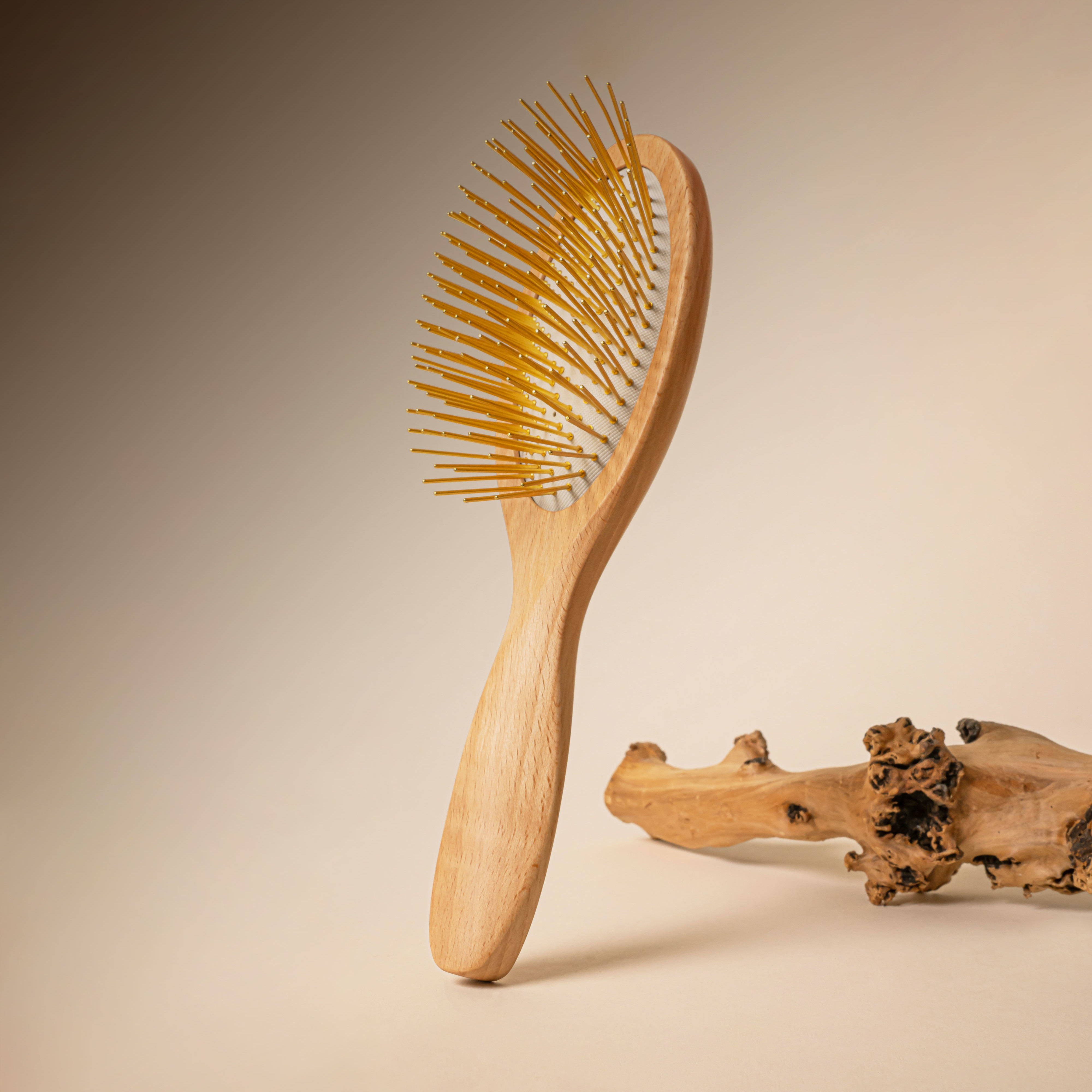職人手作りのカーブが美しいウッドの持ち手は、ヘアや頭皮だけでなく、使う人の心もラグジュアリーな世界へ導きます。24Kゴールドメッキの150本の針が頭皮と毛根を刺激し、健康な頭皮環境を整え、髪のボリュームもサポートします。