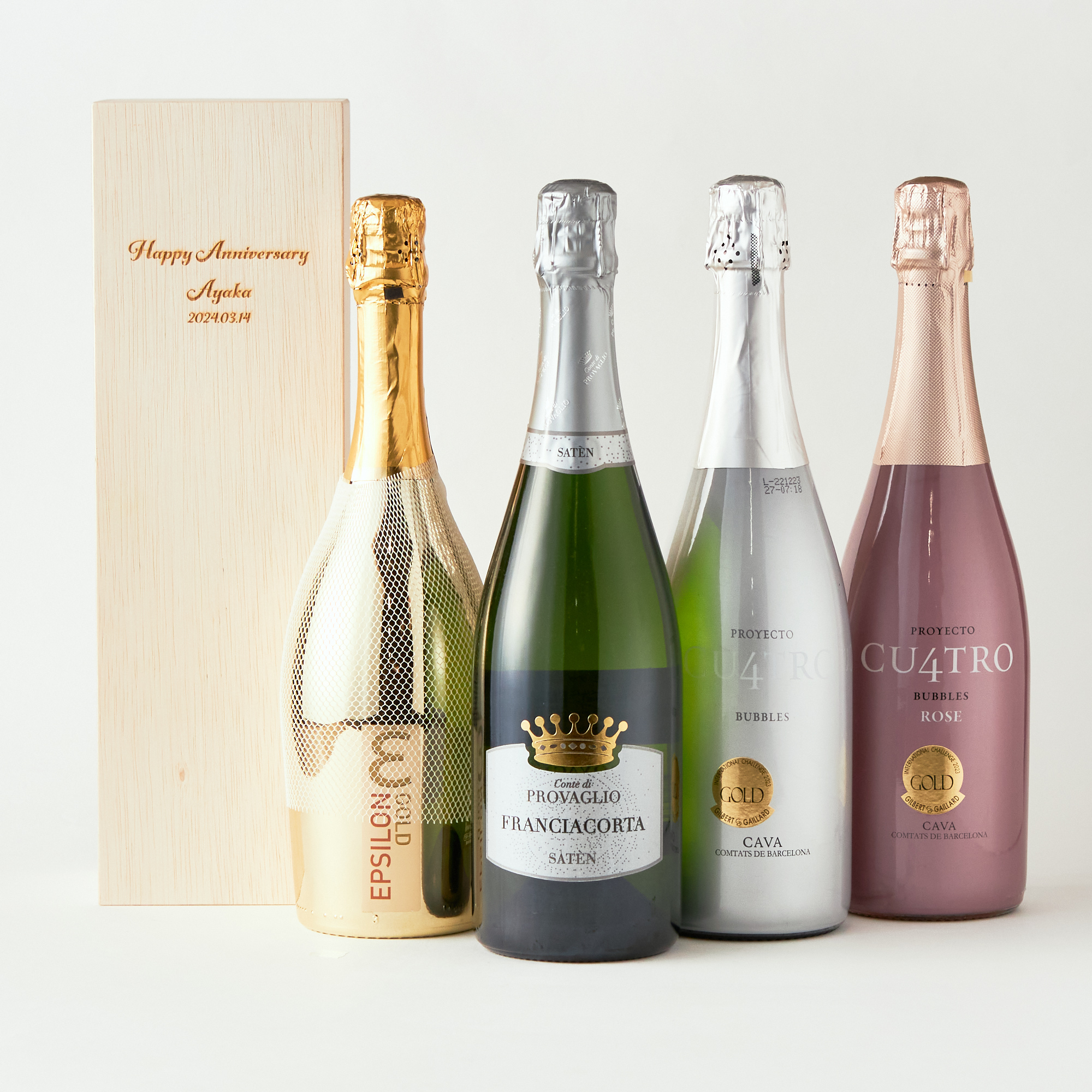 上質な木箱に入れてお届けするスパークリングワインです。バイヤーが厳選した4種類の中からお一つ選んで頂いたワインを木箱にセットしてお届けします。また木箱には刻印が可能です。