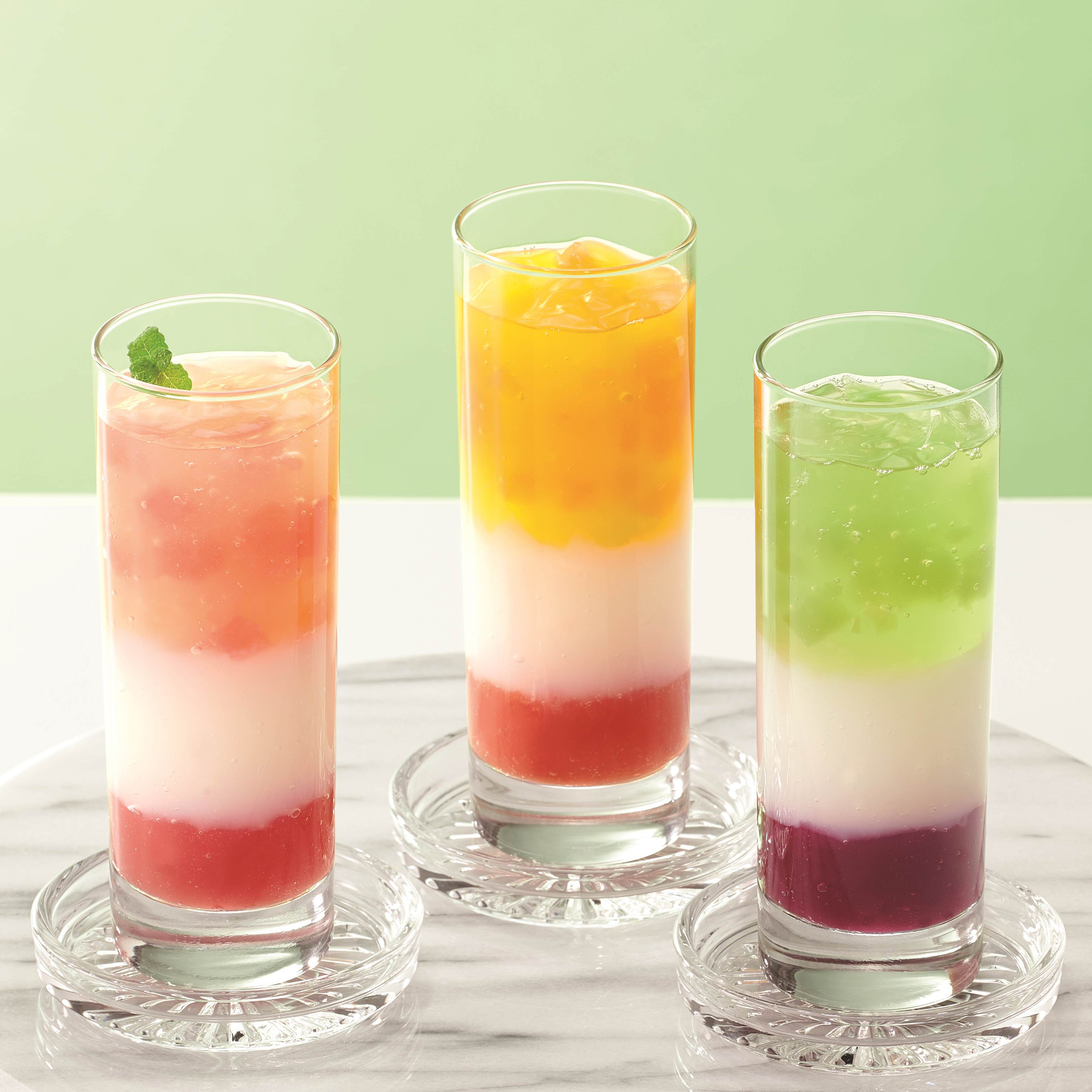 大口注文・法人のお問い合わせはこちら口どけの良いジュレともちもちのフルーツわらび餅。 爽やかなヨーグルトゼリーを挟んで、最後にとろりとしたフルーツソース。 食べ進めるごとに味わいと食感が変化する、当社夏ギフト売り上げNo1の贅沢な3層パフェデザートです。 サマーギフトとして幅広い年代の方々にご利用いただいております。