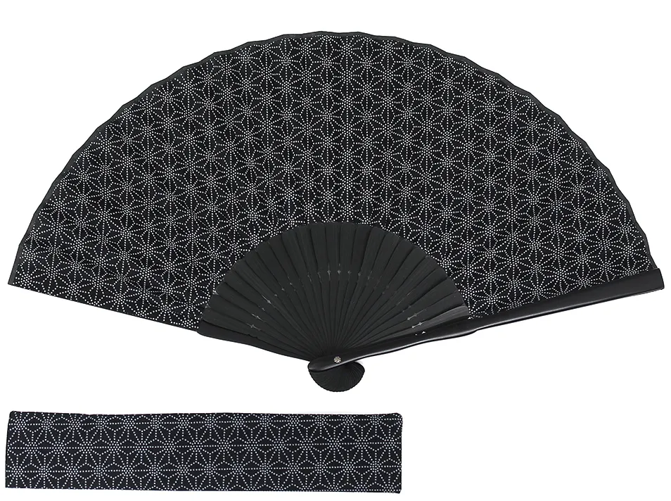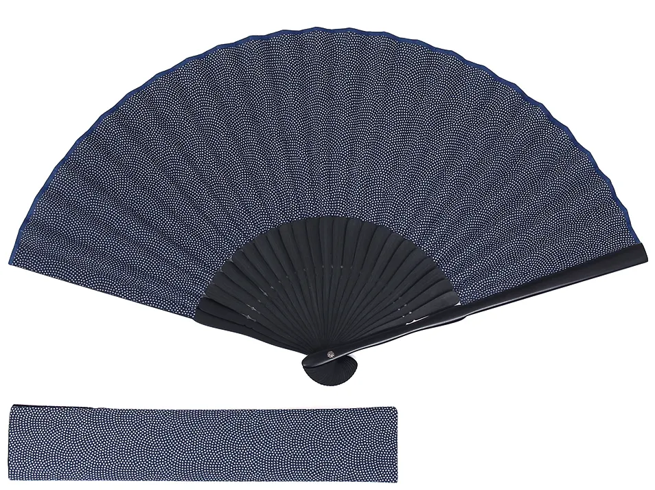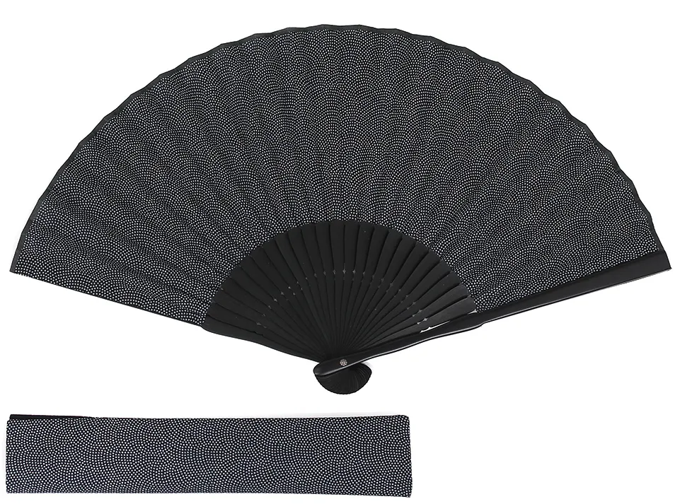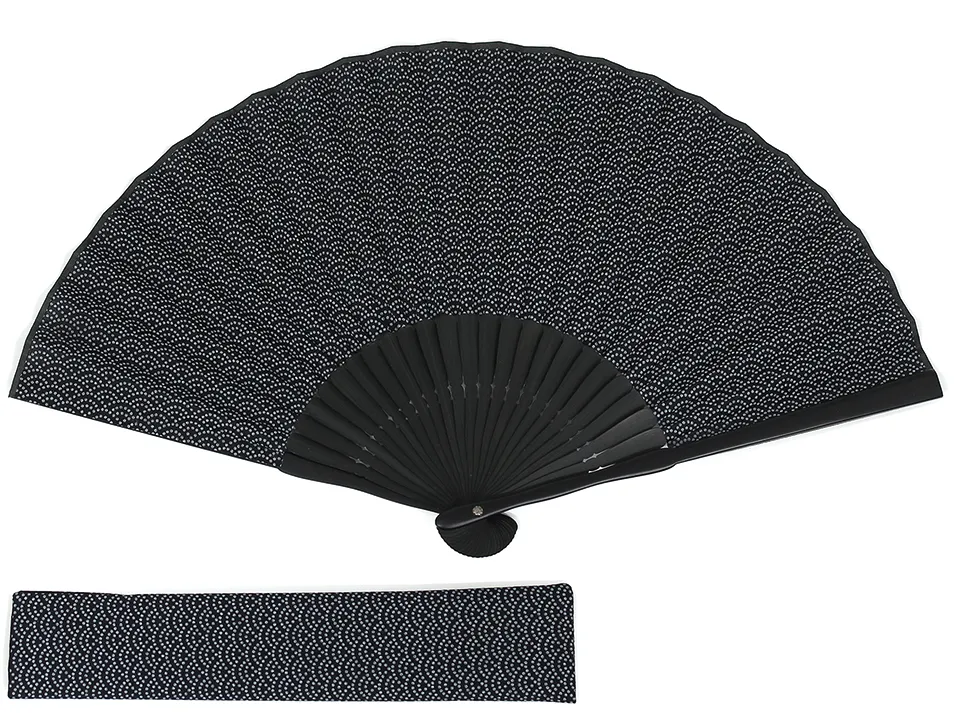 古くから日本人に好まれてきた小紋柄を、絹張りした型を使って綿素材に絞り風にアレンジして刷り上げ、黒骨の扇子に仕立てました。半艶に加工した親骨が和調の柄をよりクールに演出します。着物やスーツにも合う、上品なデザインです。