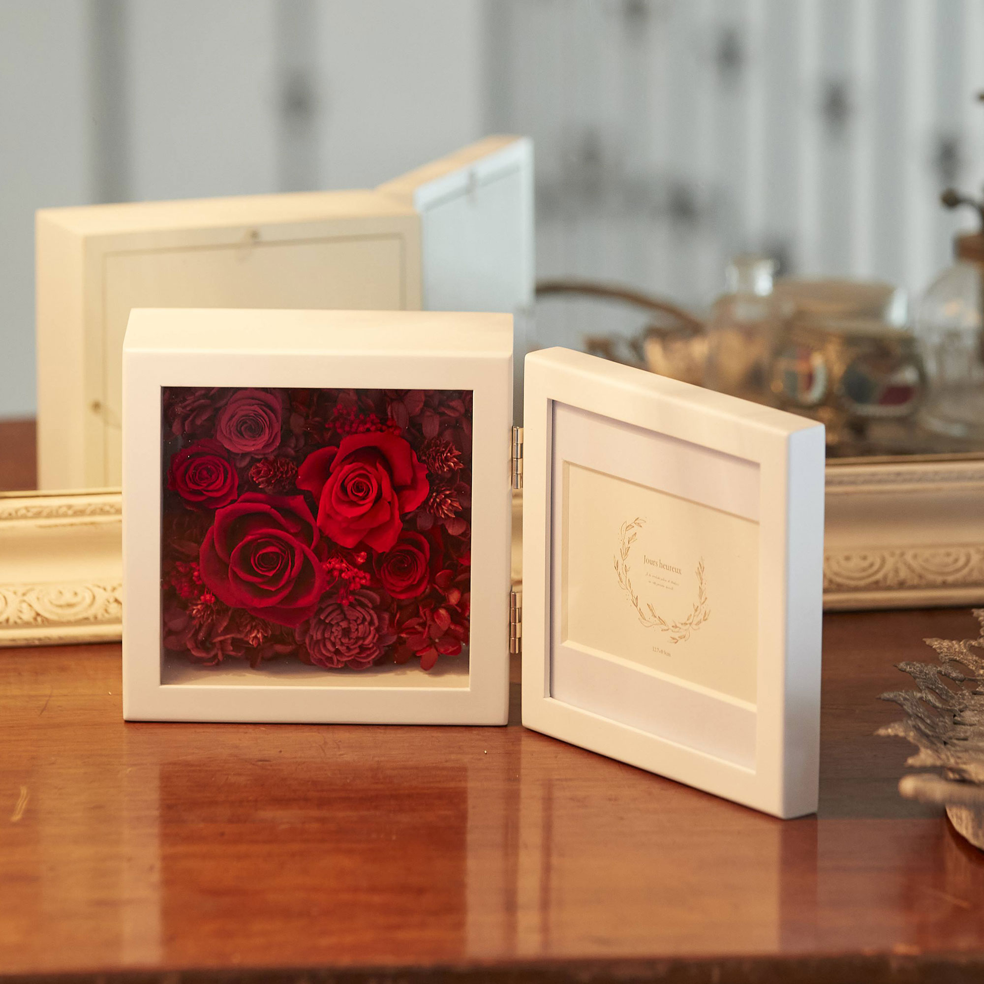 大口注文・法人のお問い合わせはこちら見開きタイプのフレームに大小さまざまなプリザーブドフラワーのバラが美しくアレンジされた商品です。 重厚感のあるホワイトのフレームが上品さを演出し、お部屋のインテリアにもマッチします。