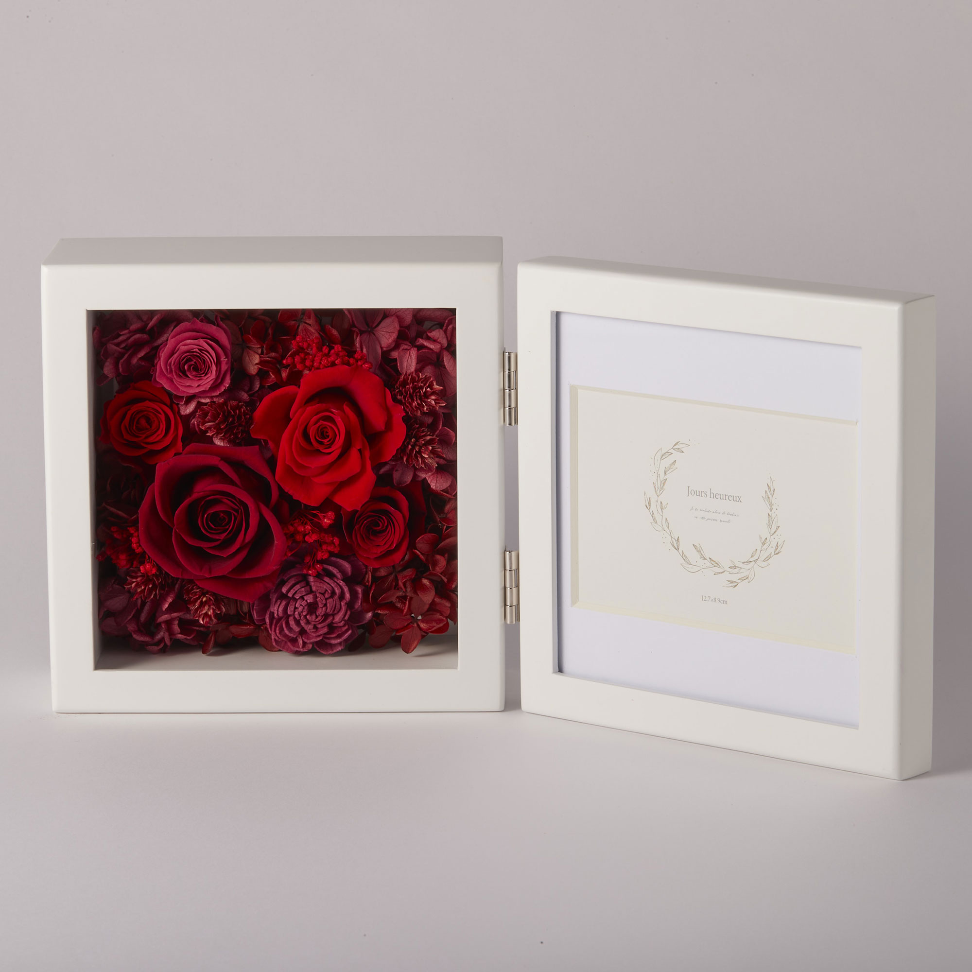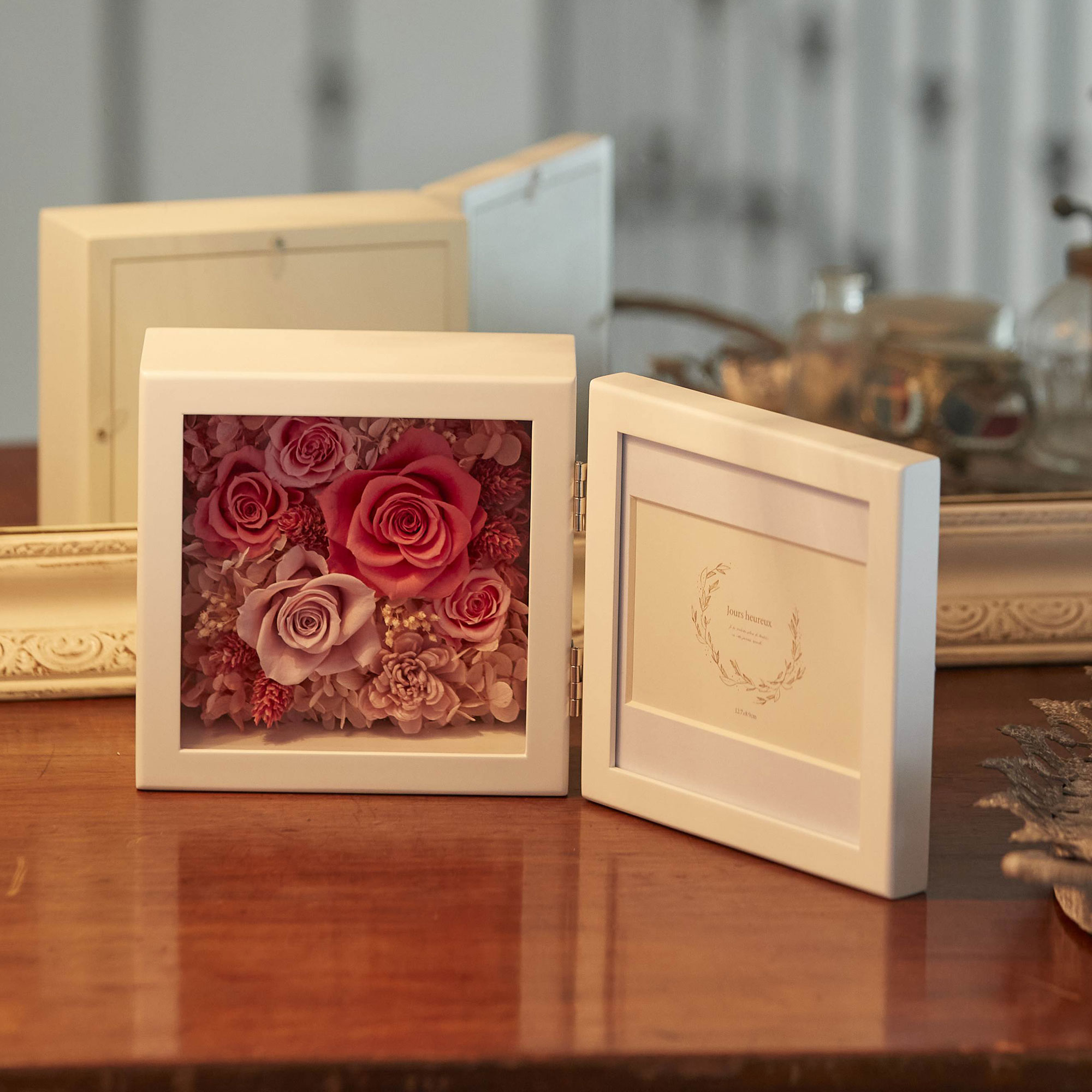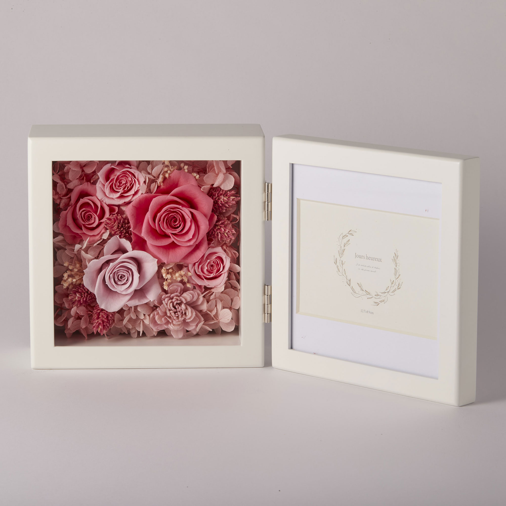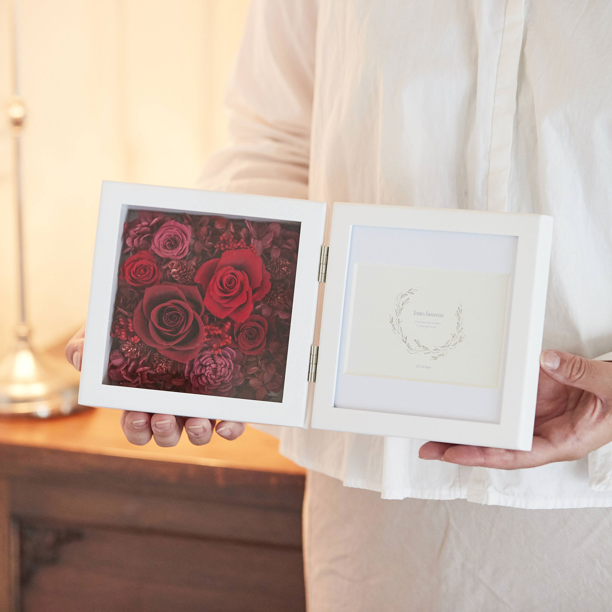 花色の濃淡でまとめたオシャレなカラーリングでプリザーブドフラワーアレンジメントとフォトフレームを組み合わせました。二つ折りの形状なので、置くスペースにより開閉ができます。大輪のバラを使用したドラマティックで華やかなフォトフレームは特別な日の写真を彩ります。