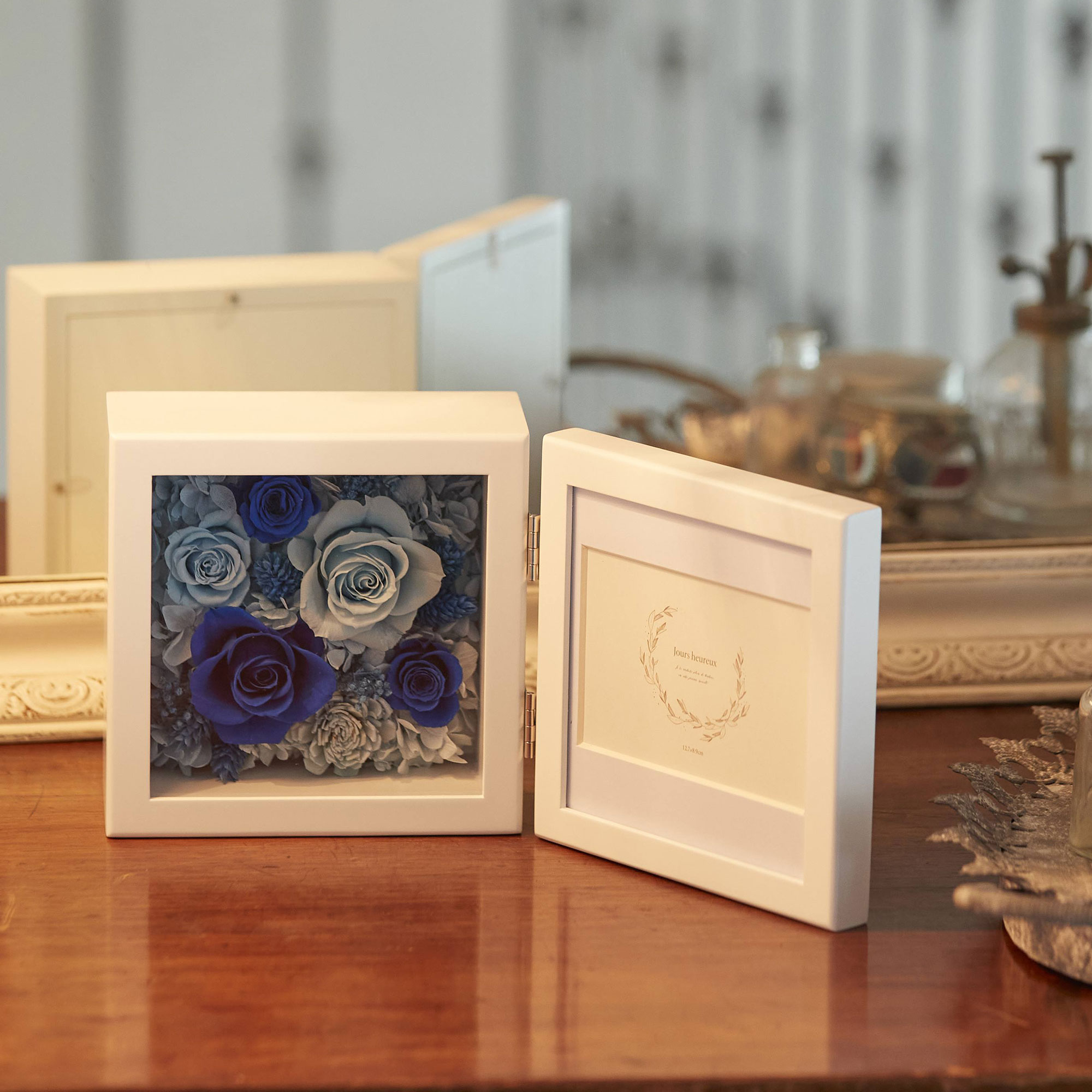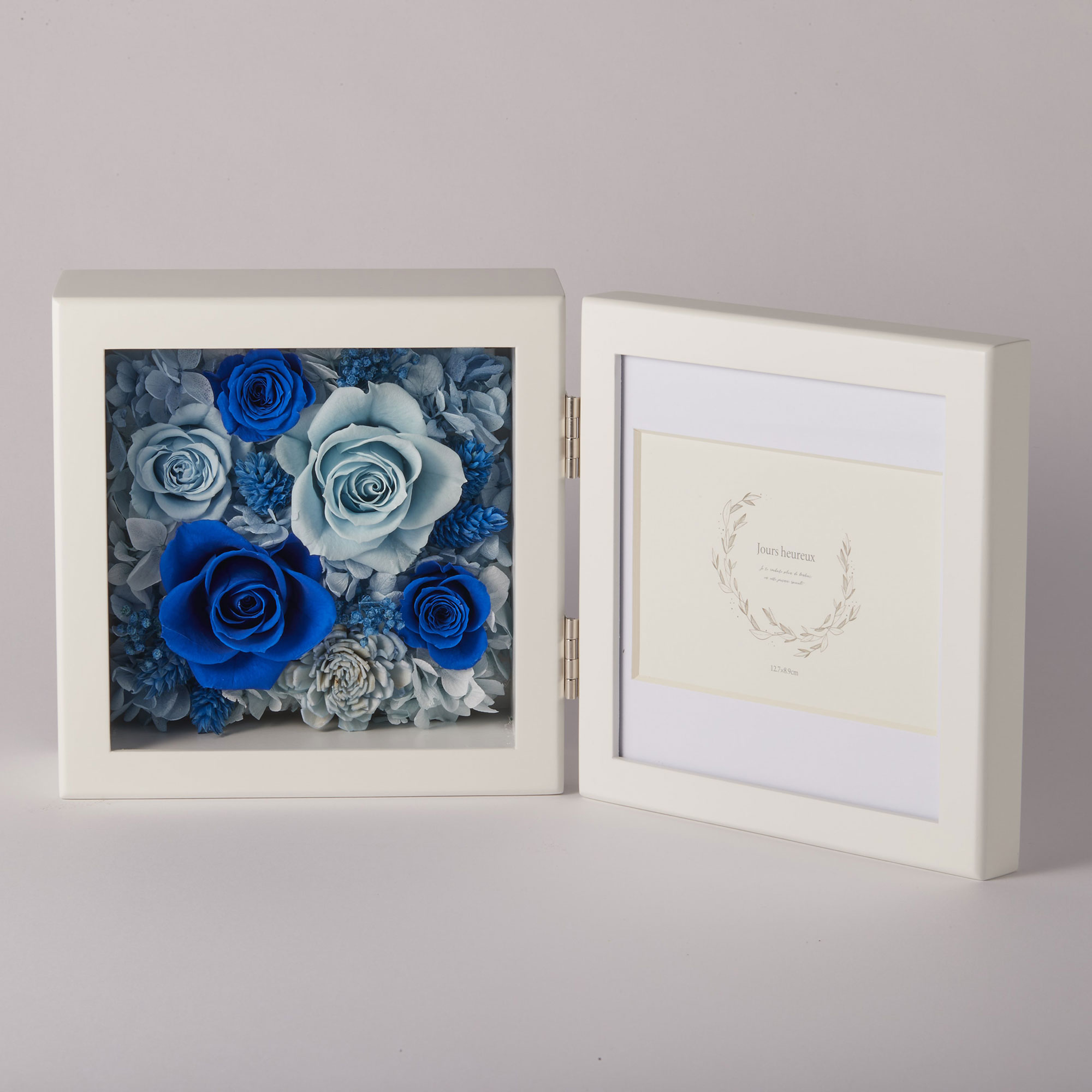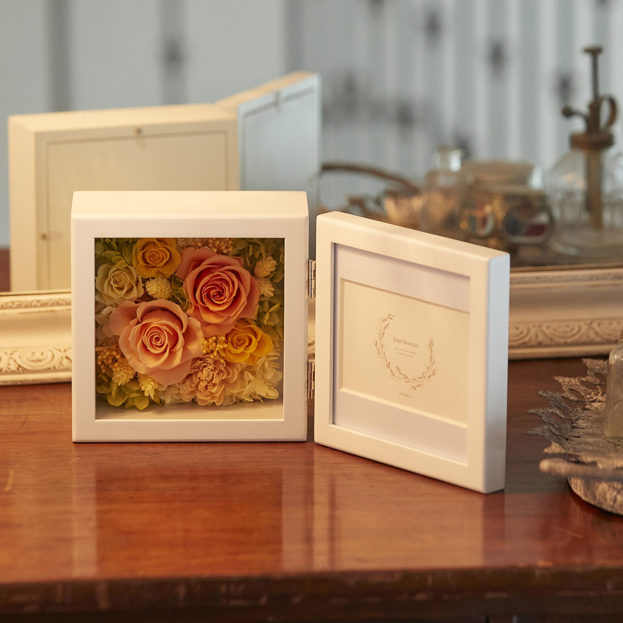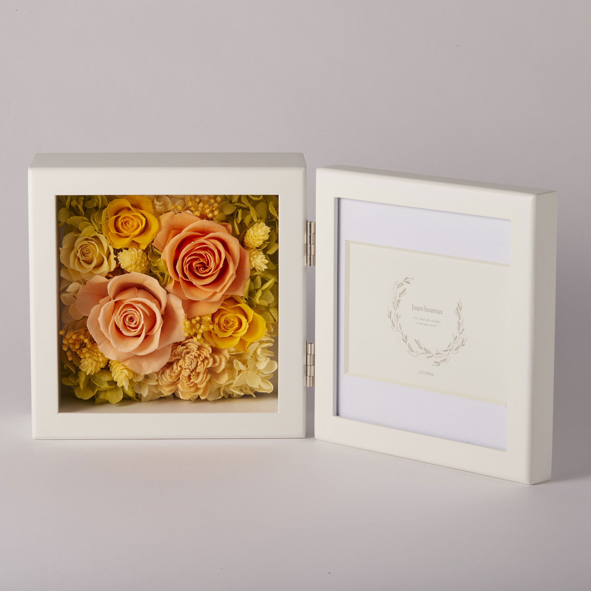 花色の濃淡でまとめたオシャレなカラーリングでプリザーブドフラワーアレンジメントとフォトフレームを組み合わせました。二つ折りの形状なので、置くスペースにより開閉ができます。大輪のバラを使用したドラマティックで華やかなフォトフレームは特別な日の写真を彩ります。