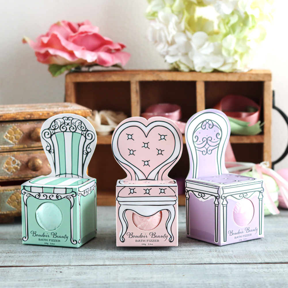 バスボール(入浴剤)が椅子をイメージしたパッケージに入ったギフト。女性の寝室を連想させるデザインの可愛いギフトです。