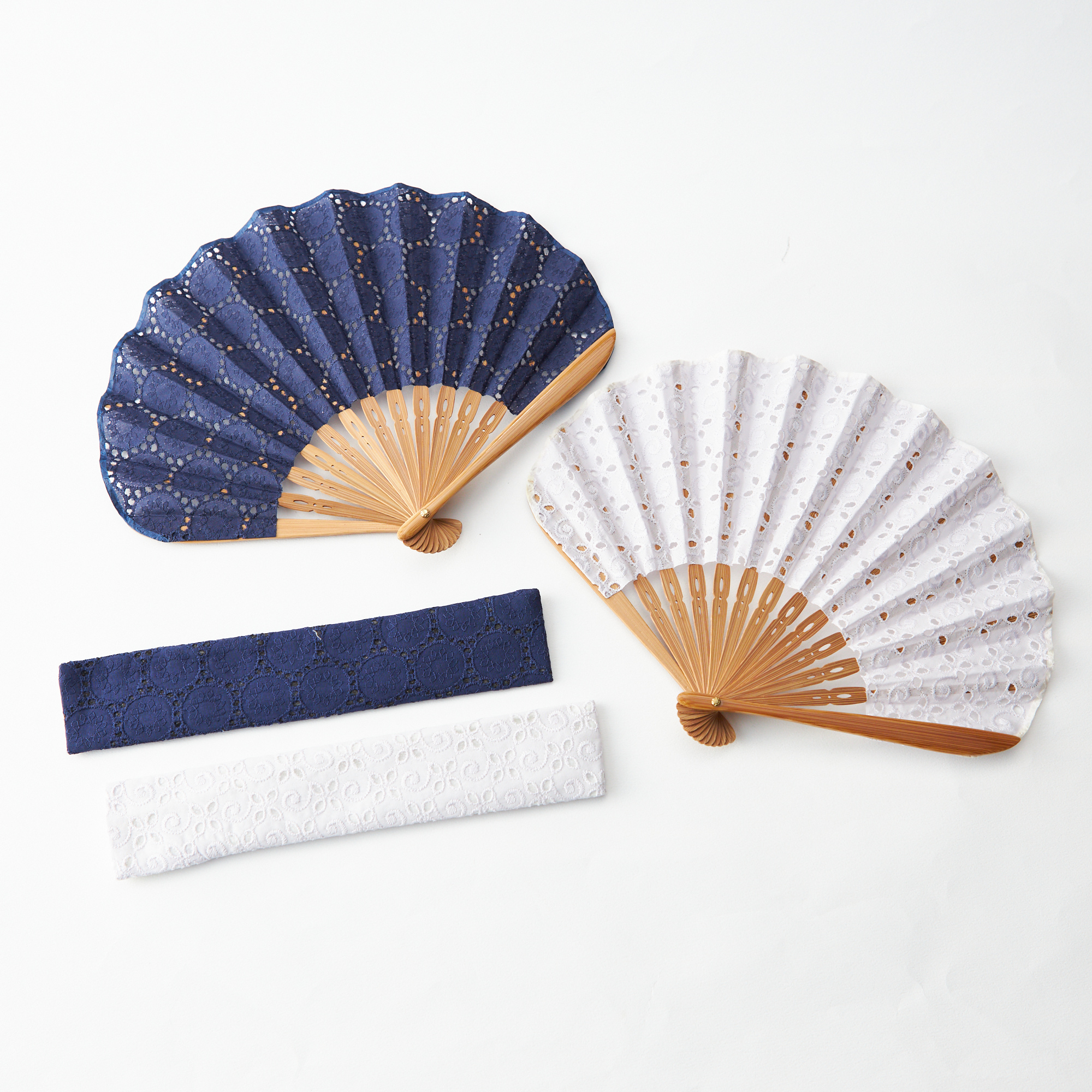 大口注文・法人のお問い合わせはこちらナチュラルな綿素材を丸みを帯びたコロンと可愛いシェル型に仕立てた扇子です。 レースの刺繍が見た目からも涼し気な印象を与え、年齢問わずお使いいただけるレース刺繍の柄は手元を上品に見せてくれます。