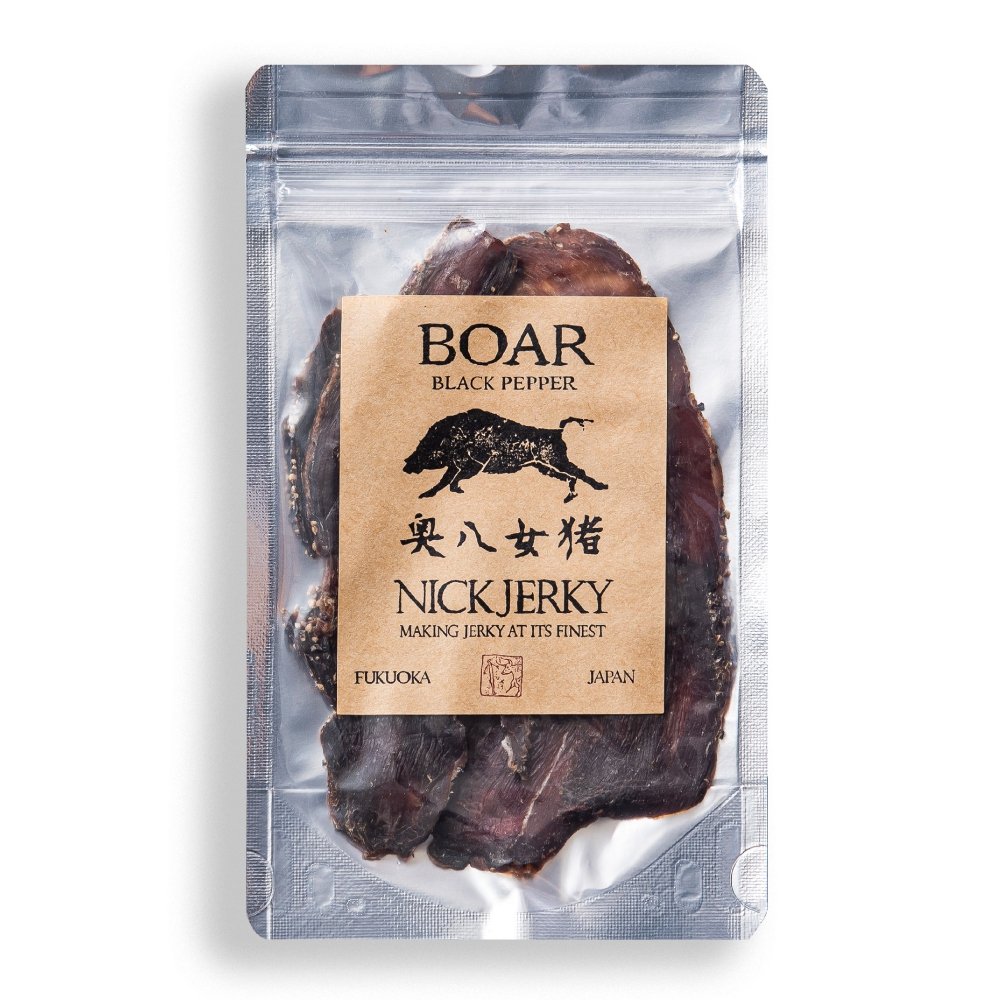 肉と塩、黒胡椒だけで作る熟成肉ジャーキーは約100gの猪肉を20gまで凝縮。肉本来の深い味わいと濃厚な旨味を誇ります。 福岡県南部の内陸に位置する奥八女-おくやめ-と呼ばれる山中にて、狩猟により捕獲され血抜きなど猟師にの手によって下処理された、天然雌猪のもも肉を使用した熟成ジビエジャーキーです。 塩は淡路島の海水を鉄釜に薪をくべて約40時間かけて炊き、杉樽で一晩寝かせた天然塩を使用しています。 ジビエ処理加工施設:奥八女ジビエ食肉センターくろ木