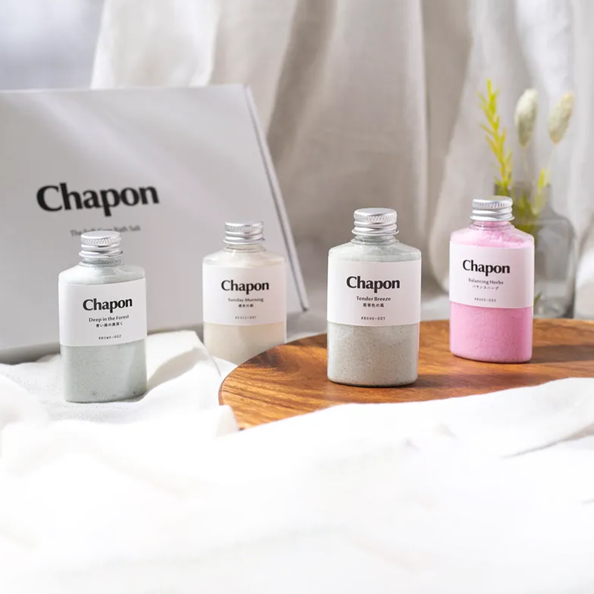 | お届け内容 | ●青い森の奥深く(Deep in the Forest) ●週末の朝(Sunday Morning) ●バランスハーブ(Balancing Herbs) ●若草色の風(Tender Breeze) ●Chapon Brand Book 1冊 ●Chapon Card 4枚 |