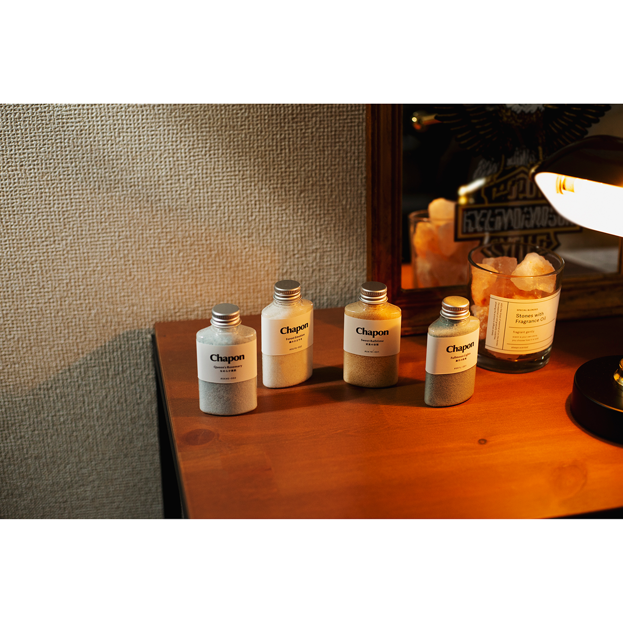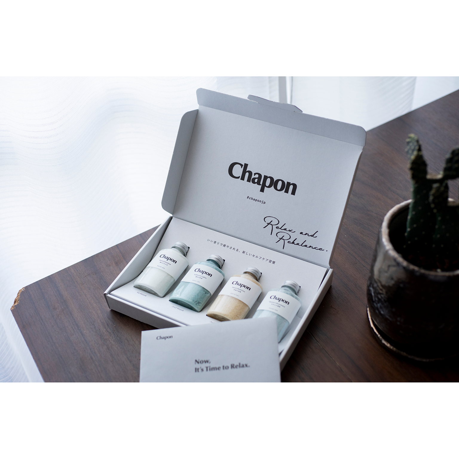 | お届け内容 | ●森のささやき(Forest Emotion) ●なめらか素肌(Queen's Rosemary) ●満月の約束(Fullmoon Lights) ●安息の空間(Sweet Bathtime) ●Chapon Brand Book 1冊 ●Chapon Card 4枚 |