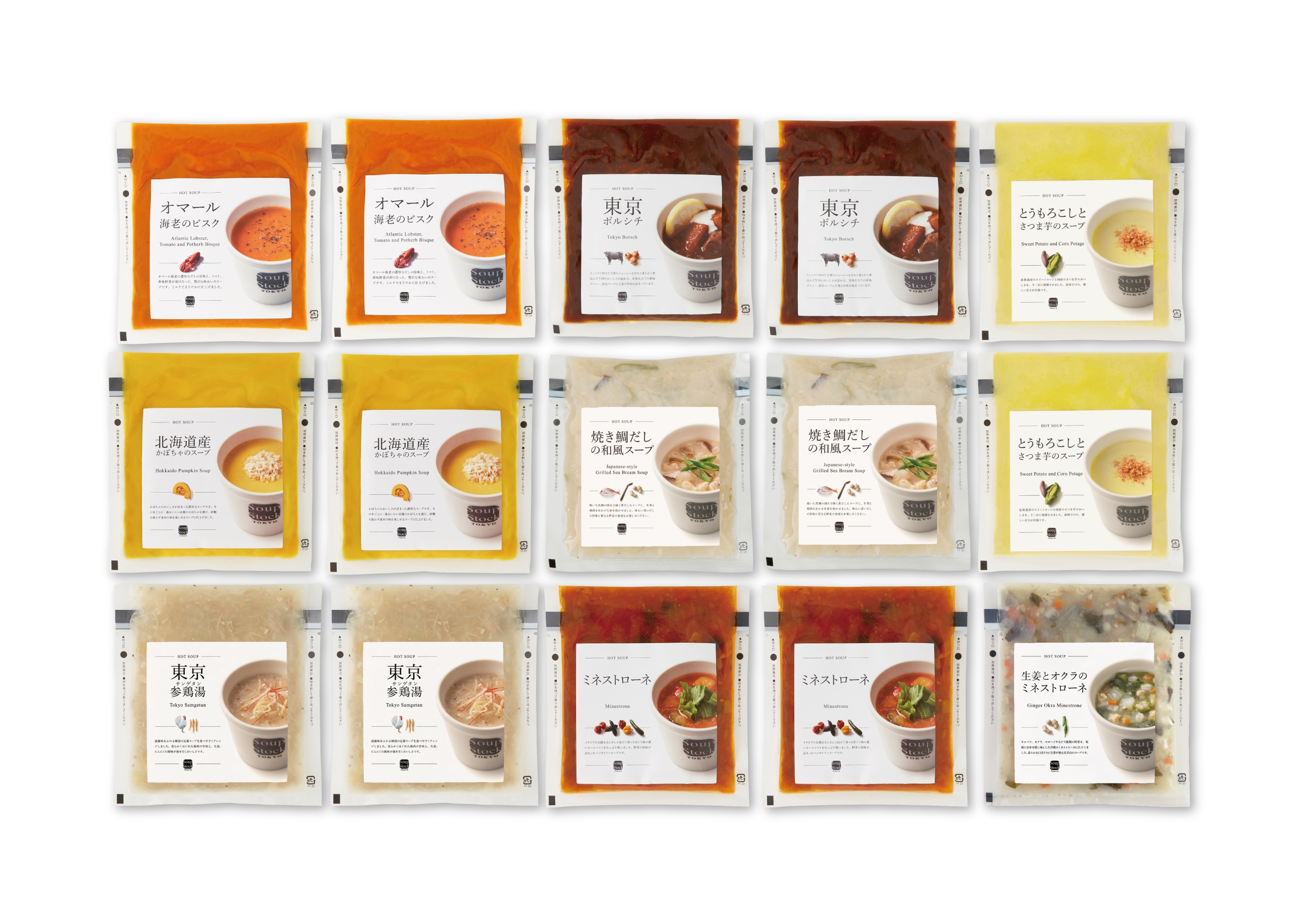 ・オマール海老のビスク×2 ・東京ボルシチ×2 ・とうもろこしとさつま芋のスープ×2 ・東京参鶏湯×2 ・ミネストローネ×2 ・北海道産かぼちゃのスープ×2 ・焼き鯛だしの和風スープ×2 ・生姜とオクラのミネストローネ×1