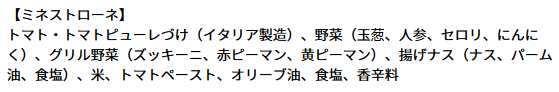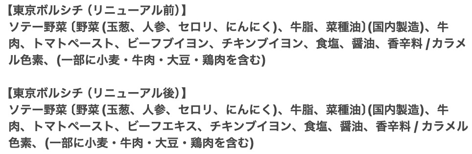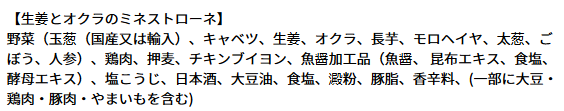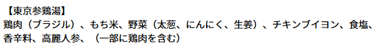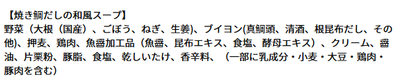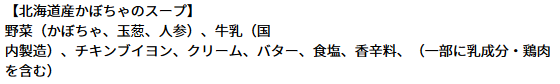 | アレルゲン情報 | 【オマール】 乳成分・えび・かに・大豆・豚肉 【東京ボルシチ】 小麦・牛肉・大豆・鶏肉 【とうもろこしとさつま芋のスープ】 乳成分・大豆 【東京参鶏湯】 鶏肉 【生姜とオクラのミネストローネ】 大豆・鶏肉・豚肉・やまいも 【ミネストローネ】 なし 【北海道産かぼちゃのスープ】 乳・鶏肉 【焼き鯛だしの和風スープ】 乳・小麦・大豆・鶏肉・豚肉 |