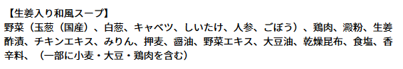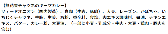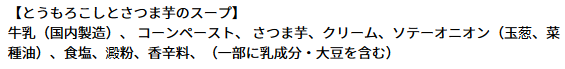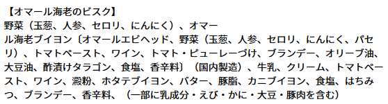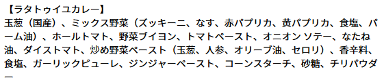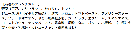 | アレルゲン情報 | ▪オマール→乳成分・えび・かに・大豆・豚肉 ▪とうもろこしとさつま芋のスープ→乳成分・大豆 ▪生姜入り和風スープ→小麦・大豆・鶏肉 ▪ラタトゥイユカレー→なし ▪海老のフレンチカレー→乳成分・小麦・えび・カシューナッツ・鶏肉 ▪無花果チャツネのキーマカレー→乳成分・小麦・牛肉・大豆・鶏肉・豚肉 |