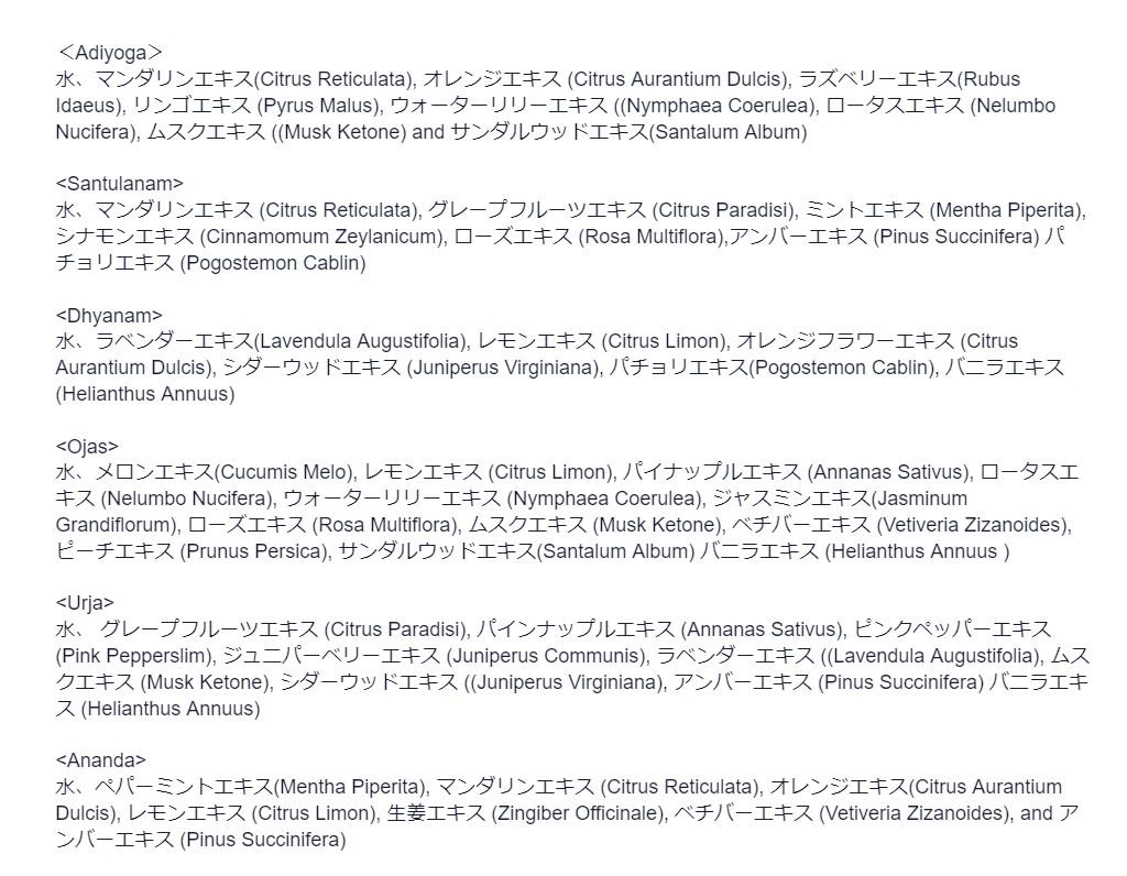 | その他の使い方 | ・瞑想で心を研ぎ澄ますために ・ハンカチの香りづけに ・名刺に香りづけて印象UP ・お部屋の香りに ・ピローミストとして ・クローゼットの中に ・手作り雑貨の香料として |