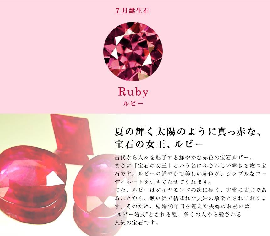 ダイヤモンド、サファイア、エメラルドと並ぶ世界四大宝石のひとつです。情熱的な赤色が美しいルビーの和名は「紅玉(こうぎょく)」。その美しさと希少性から「宝石の女王」とも呼ばれています。太陽のように鮮やかに輝く赤いカラーは、ファッションのアクセントにもぴったり。シンプルなファッションのアクセントとしても活躍してくれます。またルビーは7月の誕生石でもあり、贈り物としても選ばれる宝石です。