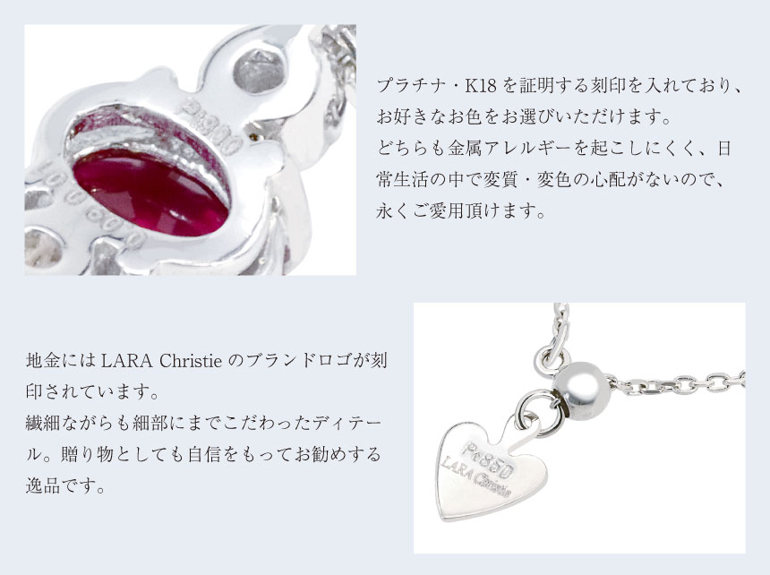 「熱情」「仁愛」「威厳」。 ルビーは古代より「勝利を呼ぶ石」といわれ、あらゆる危険や災難から持ち主の身を守り、困難を打破して、勝利へと導くパワーがあるといわれています。自分に自信をつけたい方や、何かに挑戦している方にピッタリの宝石です。また、新しいことにチャレンジしている方や、夢を叶えるために努力している方へ贈るときにも相応しい宝石です。宝石の価値としても高いため大切な方へのプレゼントとしても人気があります。ララクリスティーではネックレス、ピアス、リングなどルビージュエリーを豊富に取り扱っています。ギフトや自分へのご褒美ジュエリーにぴったりな逸品です。