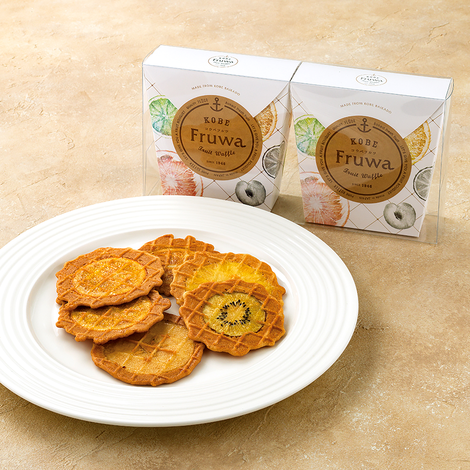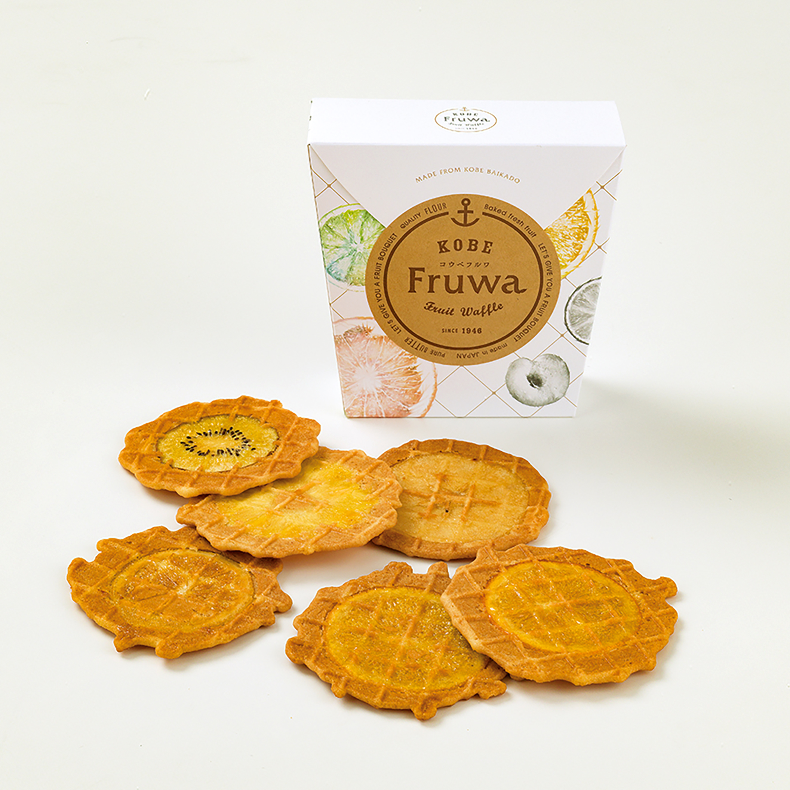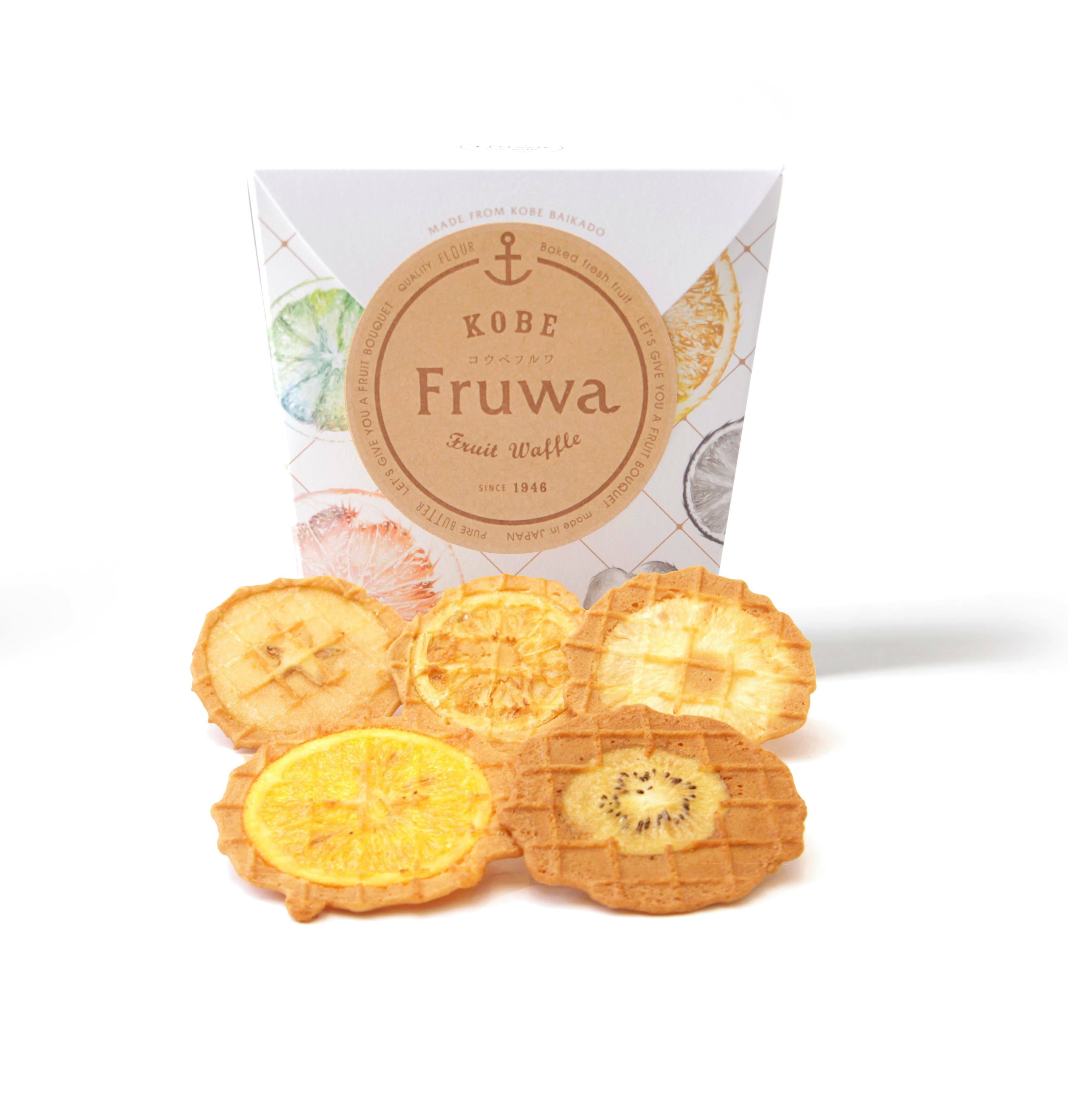 フルワ全種が味わえる詰め合わせ。ワッフルは1枚ずつ個包装になっております。 合計12枚入り(6枚×2箱) <1箱の内容> ・パイナップル・キウイ・レモン・アップル×各1枚 ・オレンジ×2枚