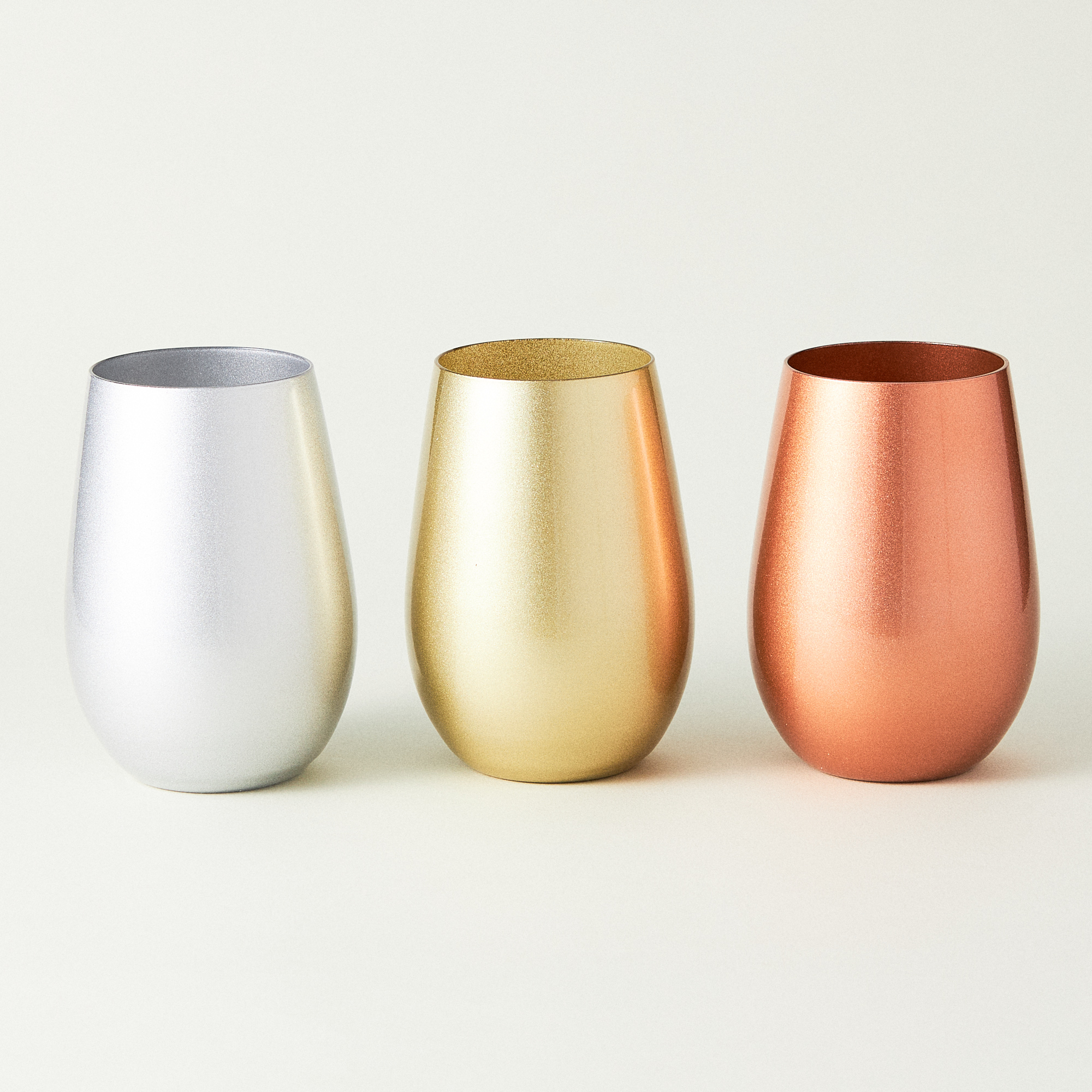 まるで金属製のようなマット塗装がポイントの「メタルカラータンブラー」と、シャンパンのようにフルーティーで華やかな香りのビールのセット。