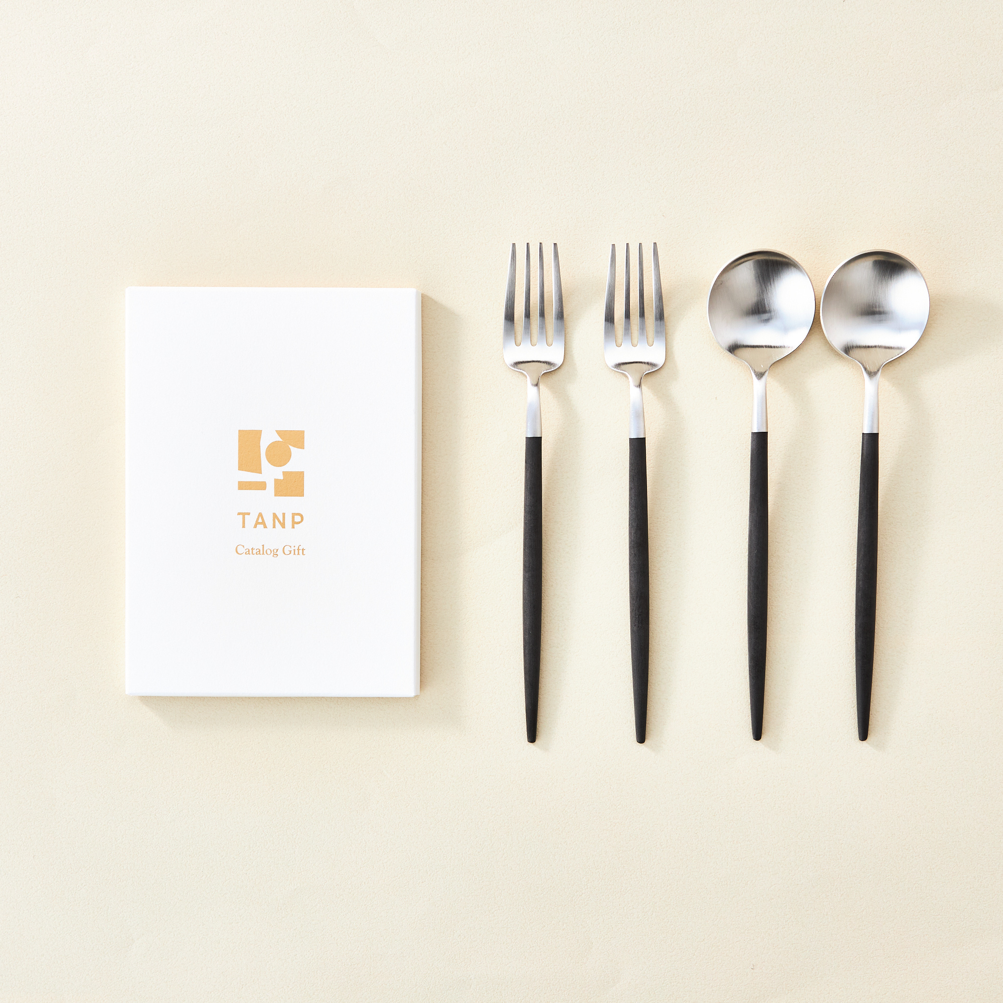 タンプオリジナルの結婚祝いにおすすめのカタログギフトと、ポルトガルのカトラリーメーカー「クチポール」のカトラリーデザートのセットです。カトラリーはゴアブラック×シルバーの4本セット。