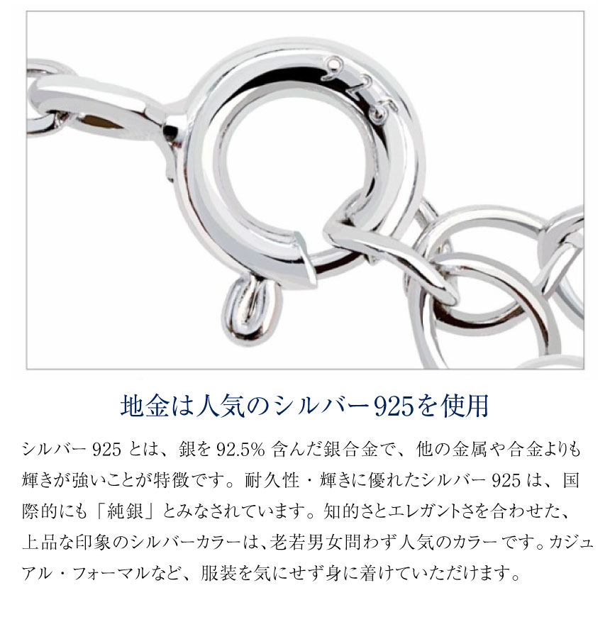 | 説明 | シルバー925とは、92.5%が純銀、残りは銅などの他の金属を混ぜて合金にして強度を強くしたものです。 |