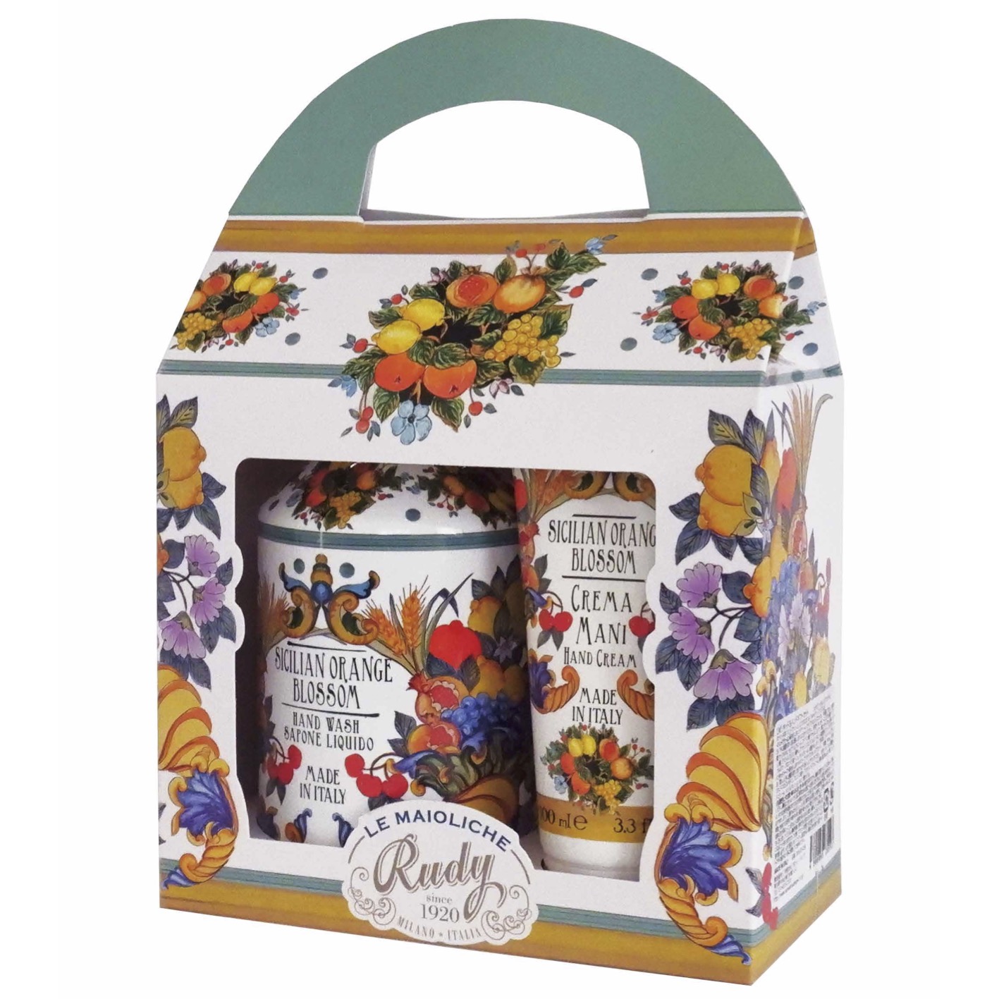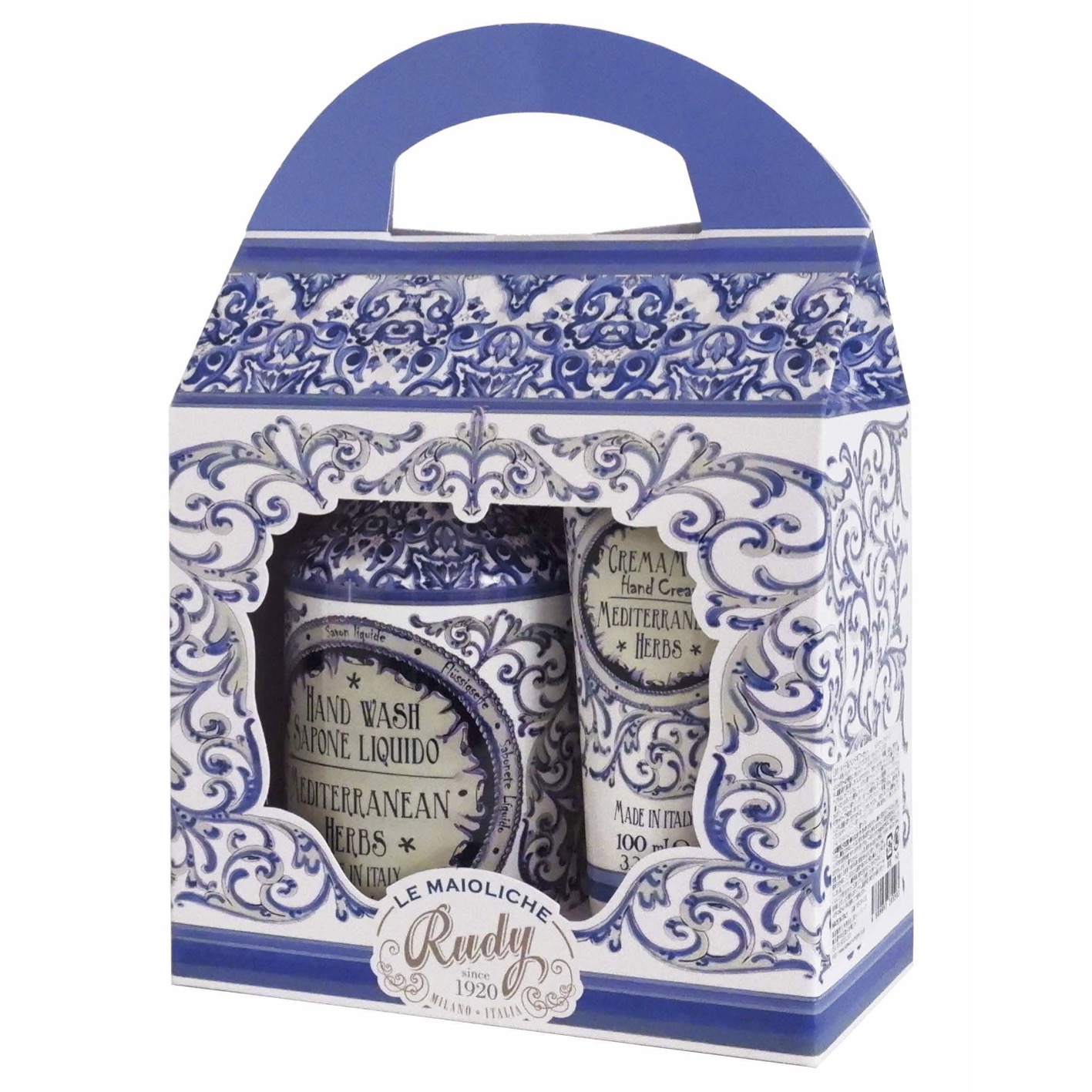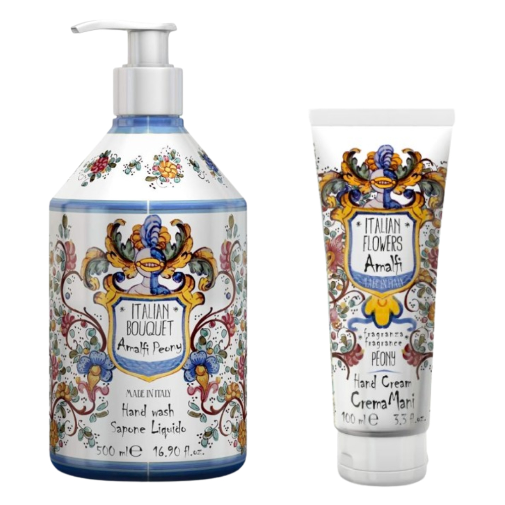 「ルディプロフューミ」が手掛ける、マヨルカ焼きの柄をあしらった「ル・マヨルカ」シリーズ。イタリア各地域のすばらしさを伝えるモチーフを施しました。何度洗っても手肌に優しいハンドソープと、持ち運びにも可愛いハンドクリームをギフトセットにしました。贈り物に最適です。