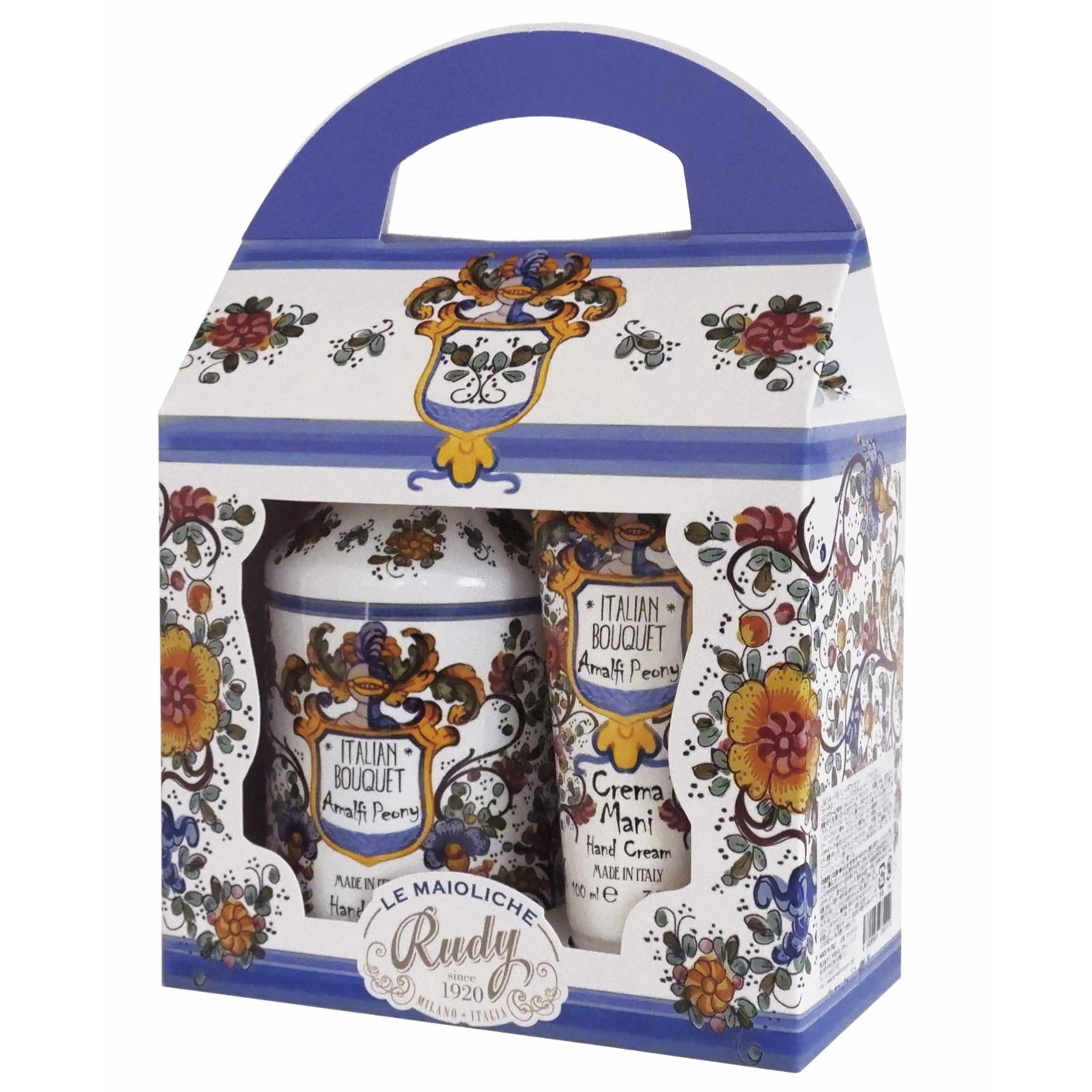 イタリア・ミラノの西アッサーゴにあり、100年の歴史を持つ老舗コスメ工場、ルディプロフューミ。1920年から始まり、今では三代目の三人の孫たち、Giorgio(ジョージオ)、Lorenzo(ロレンゾ)、Cristina(クリスティーナ)がそれぞれの才能を発揮しながら、昔からの伝統を守りつつ、現代の市場にあった新しい商品を生みだしています。 イタリアのルネサンス時代に発祥した白地に色鮮やかな色彩を施したマヨルカ焼きは、スペインのマヨルカ島を経由してシチリアに入ってきたことでその名が付きました。主にストーリー性を盛り込むことが多い焼き物で、歴史上の出来事や伝説が描かれることが多かったそうです。 このイタリアの歴史を担った伝統工芸へのオマージュであり、イタリアの各地域のすばらしさを伝えるモチーフとしてマヨルカ焼きの柄を施したシリーズが「ル・マヨルカ」です。