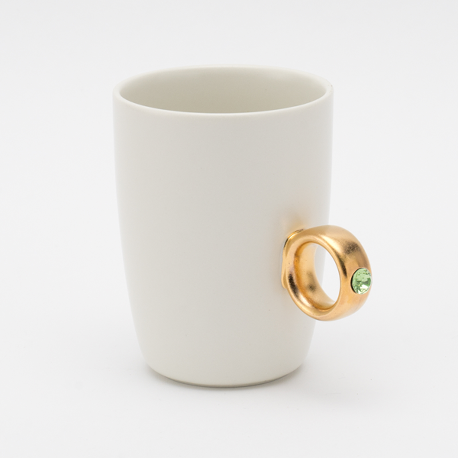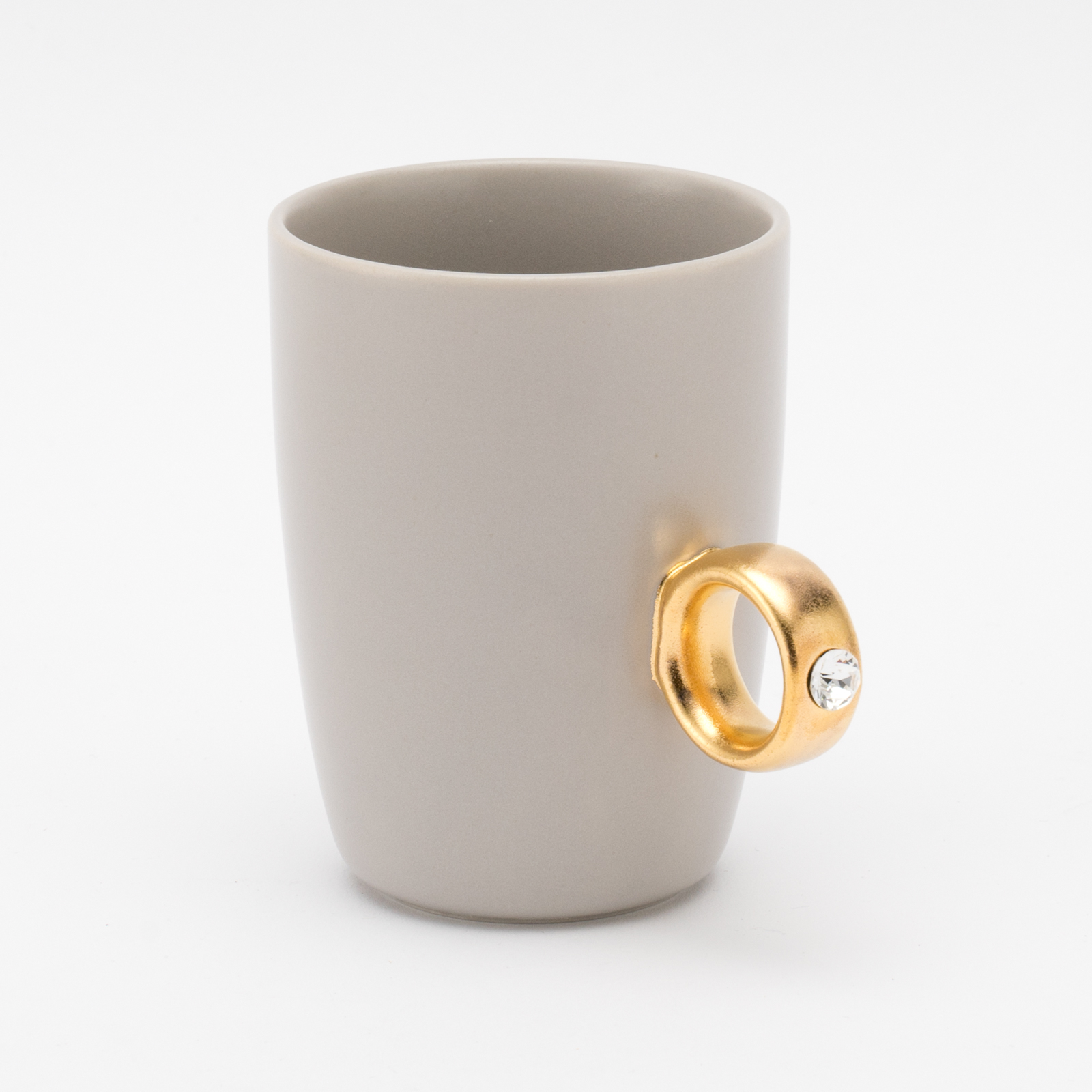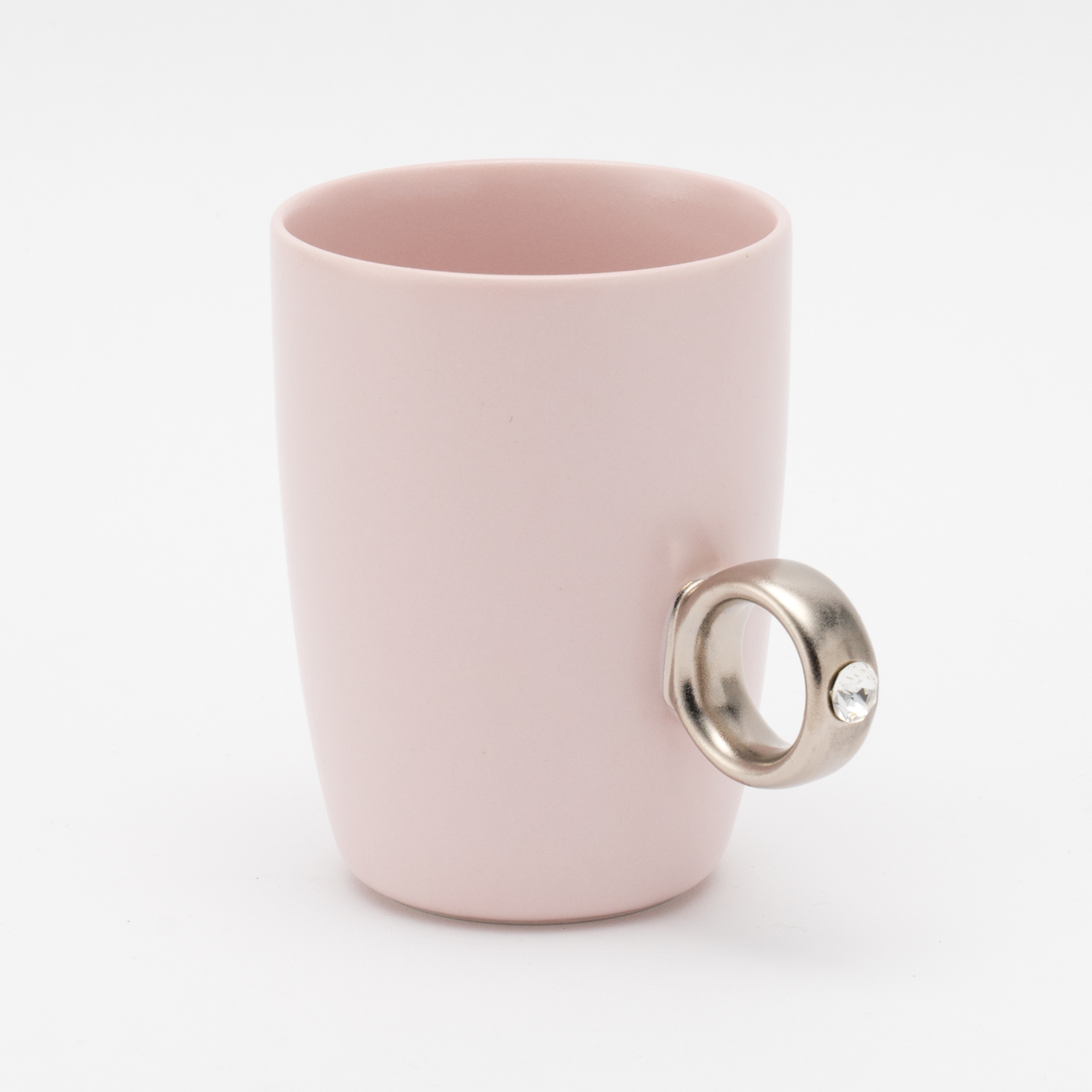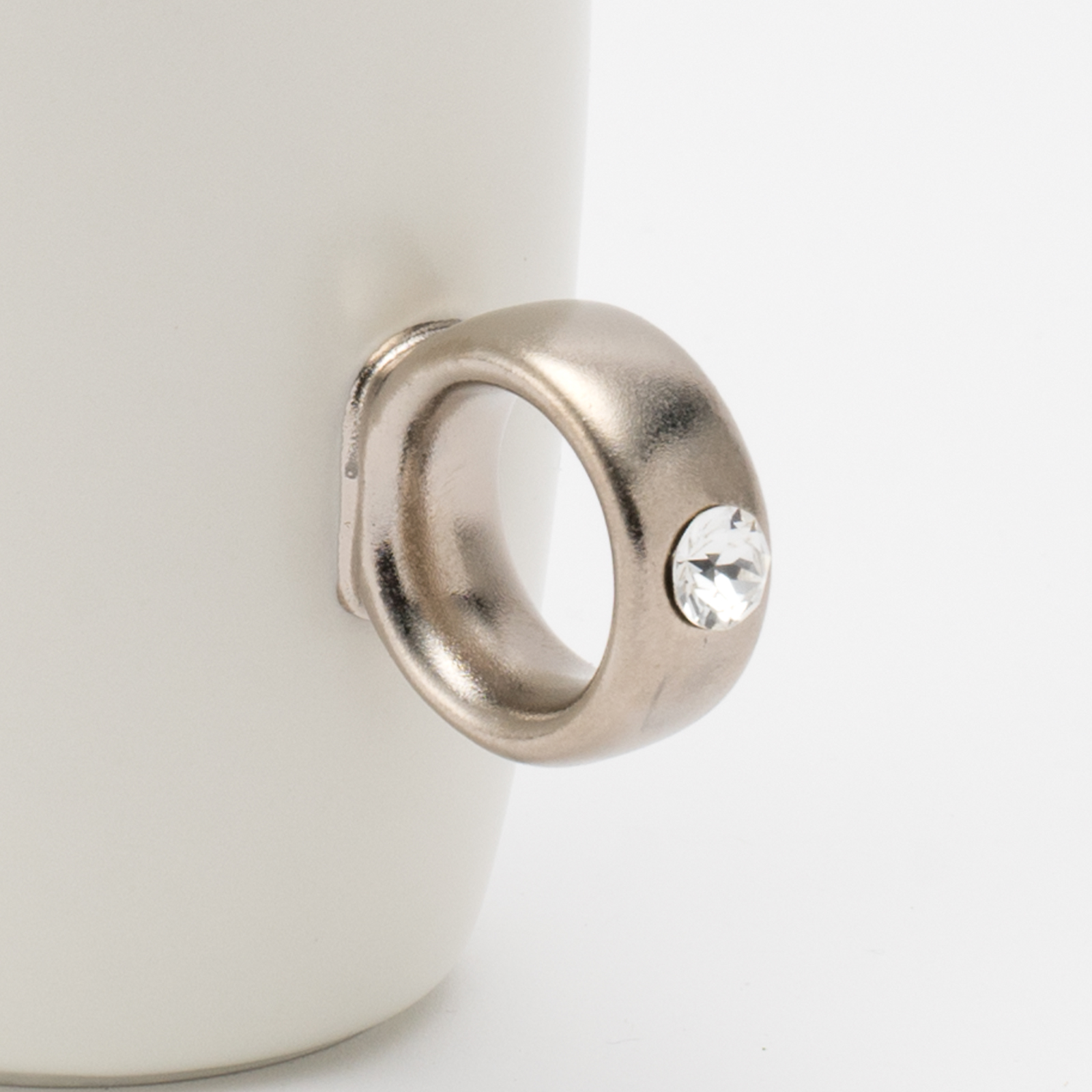 リング部分は純度の高い金と白金を使用しており、職人が筆で一つひとつ手塗りで仕上げています。また、V字に彫り込まれたリング部分に、8mmのクリスタルガラスを埋め込むことで、奥行きのある煌めきを演出しました。指輪をはめるように、カップの取手に薬指を入れカップを握ると、まるで本物の指輪をつけているかのようになるマグカップです。