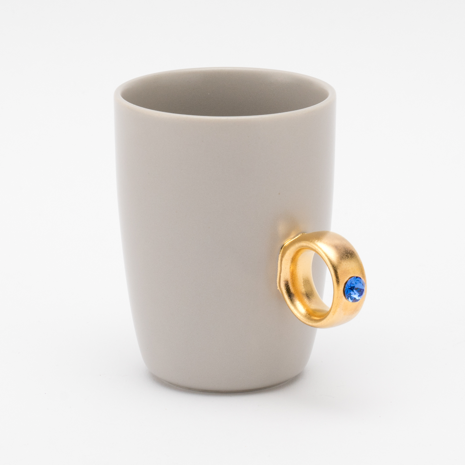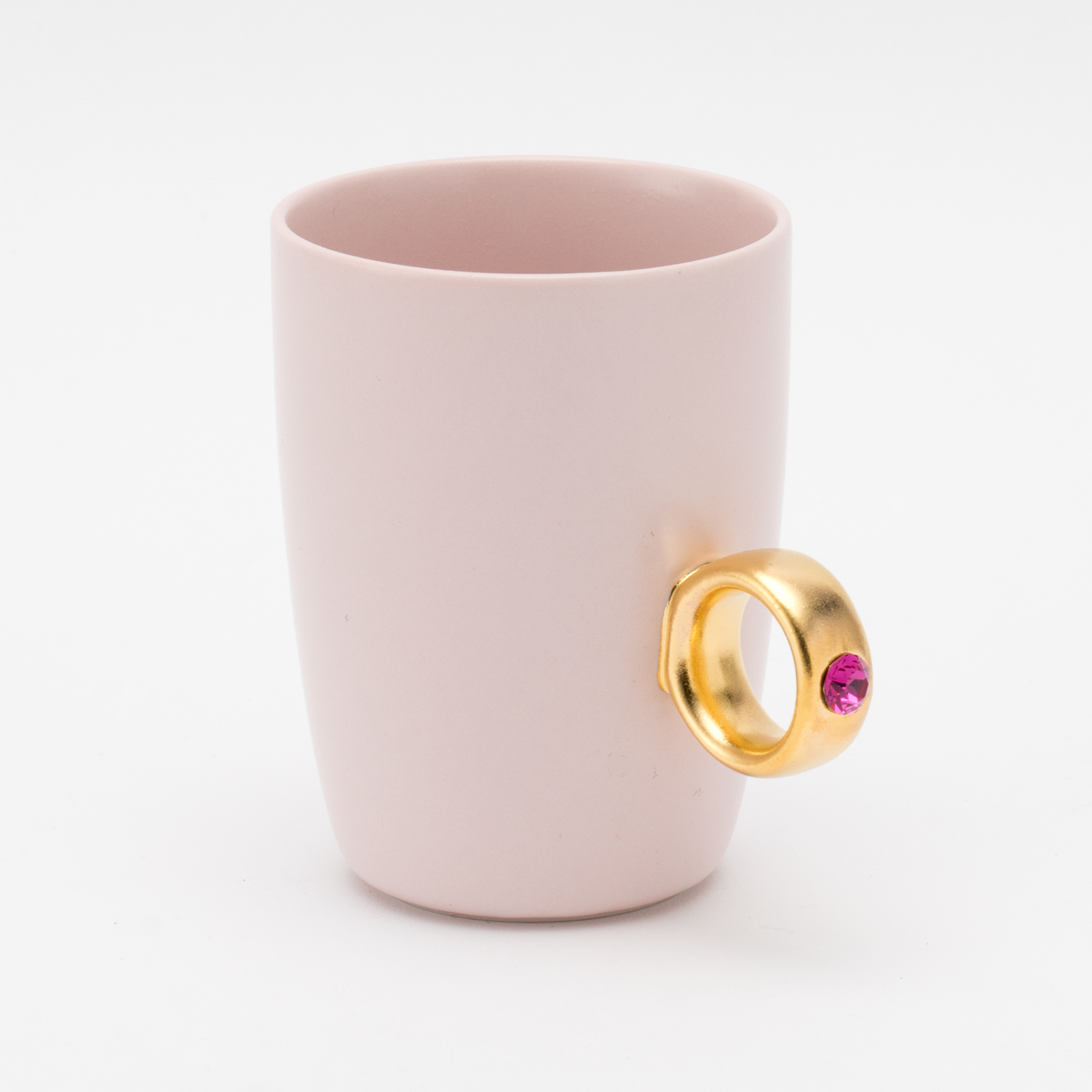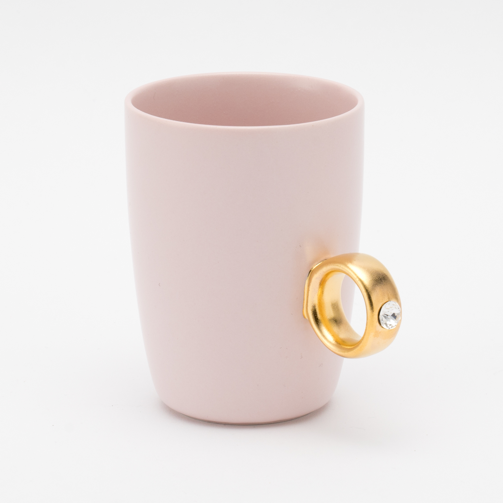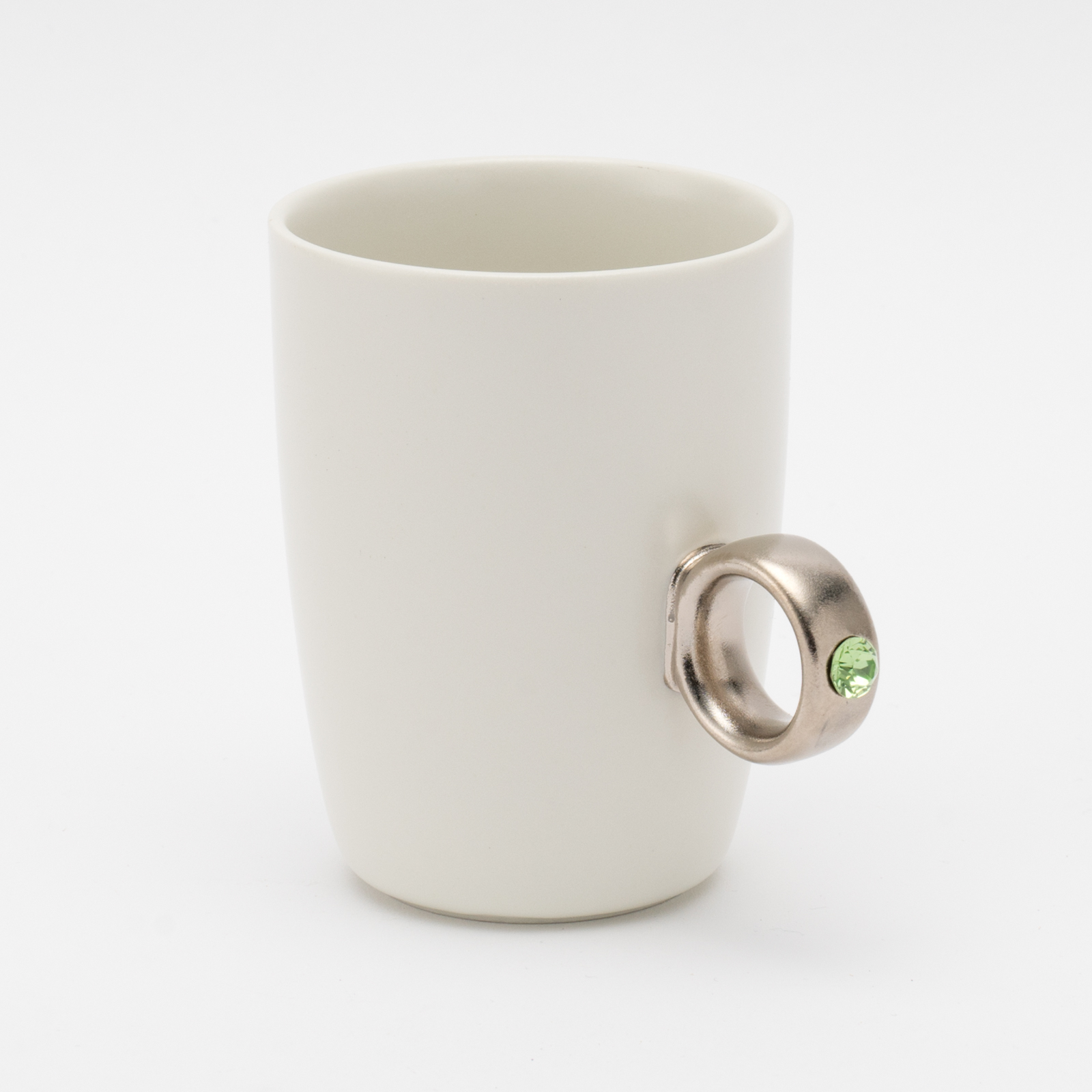 リング部分は純度の高い金と白金を使用しており、職人が筆で一つひとつ手塗りで仕上げています。また、V字に彫り込まれたリング部分に、8mmのクリスタルガラスを埋め込むことで、奥行きのある煌めきを演出しました。指輪をはめるように、カップの取手に薬指を入れカップを握ると、まるで本物の指輪をつけているかのようになるマグカップです。