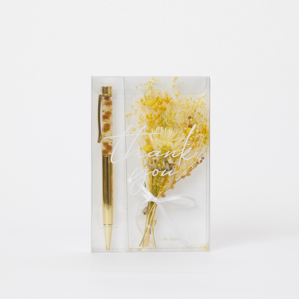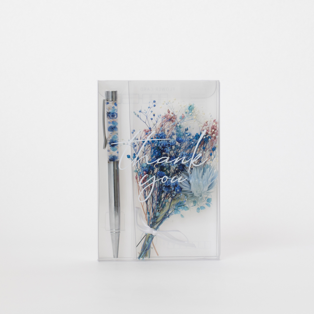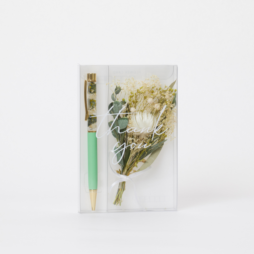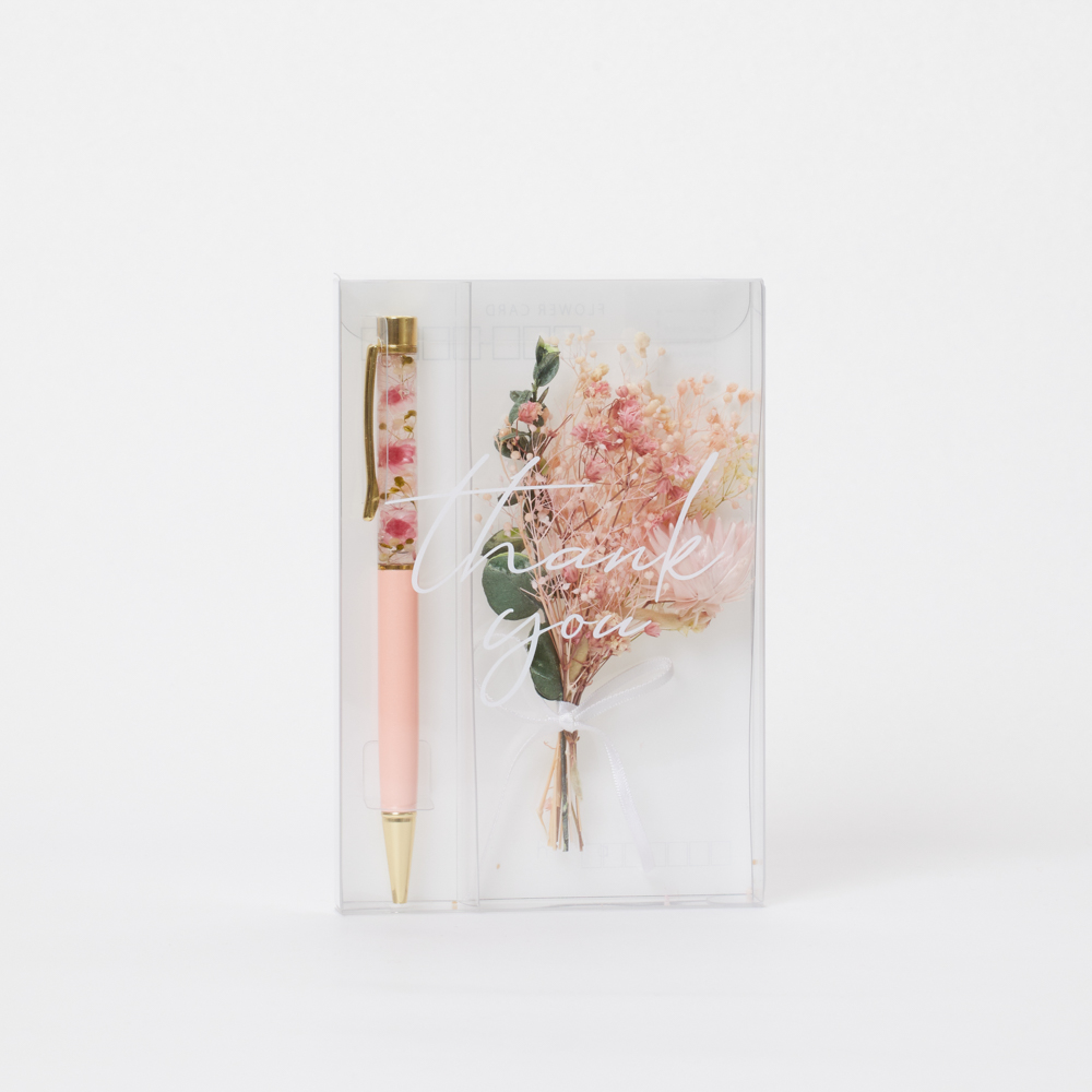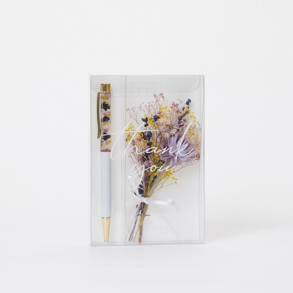 ハーバリウムボールペンにThank youのメッセージと花を添えて、大切な方への贈り物にできます。ハガキになっているので、郵送で送れます。