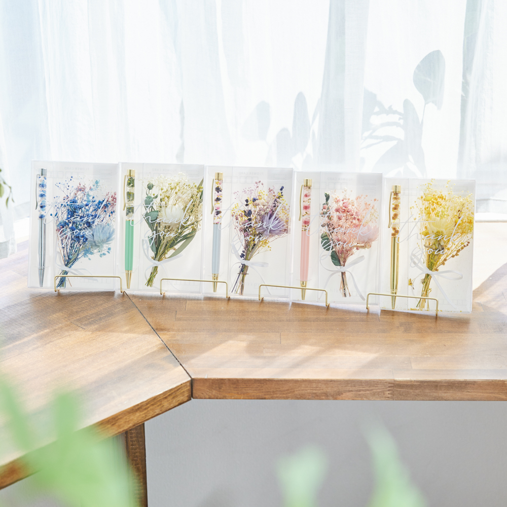 大口注文・法人のお問い合わせはこちらhikkaならではのデザインのハーバリウムボールペンとミニブーケをハガキにしました。 切手を貼ってポストに投函可能なので、遠くにいる方にも感謝の想いをいつでも伝えられます。