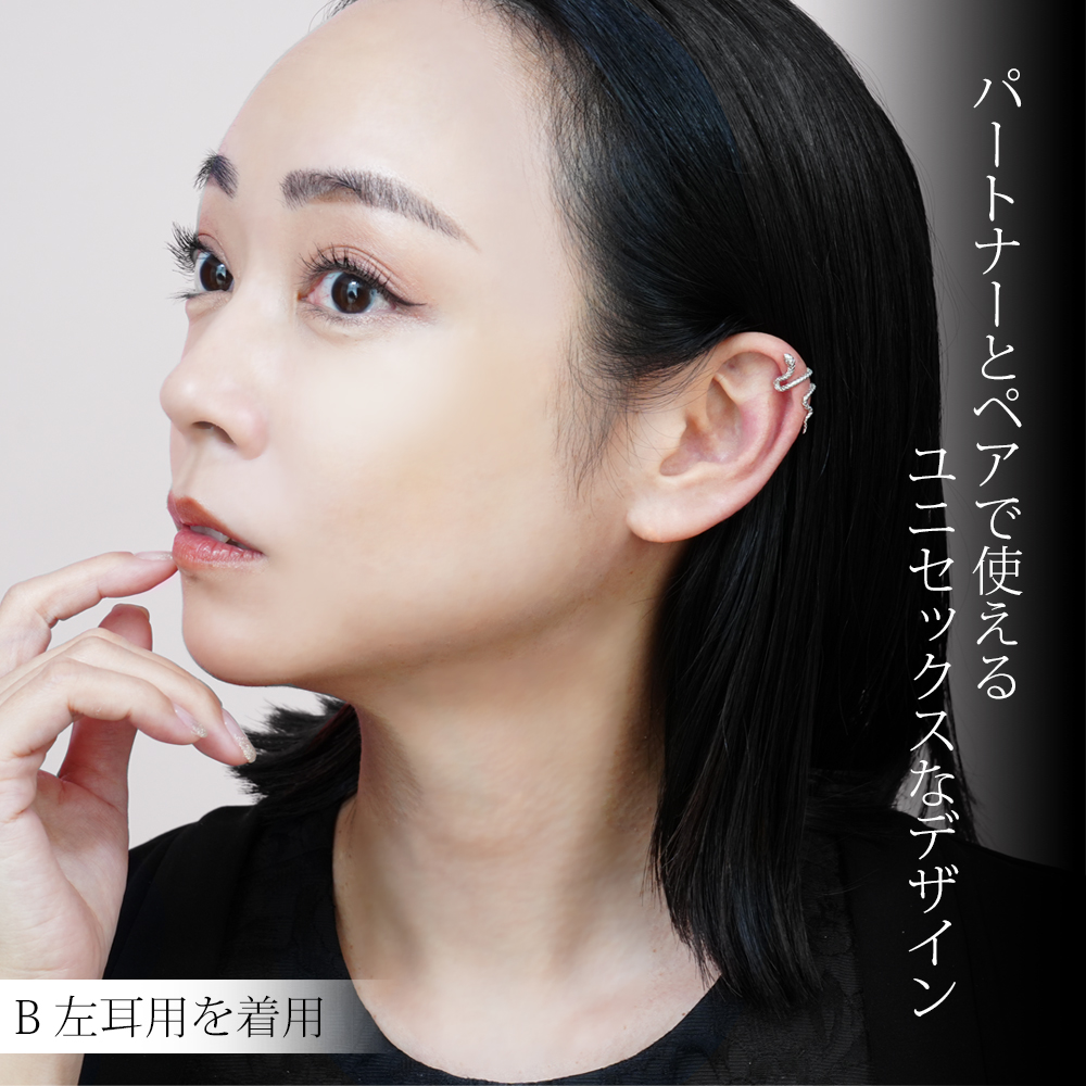 なめらかで柔軟な素材のシルバー925を使用。誰でも簡単にサイズ調整が可能です。 ピアスホールがある方は、干渉しない位置でバランスを楽しんだり、ホールがない方は、気軽に耳元のおしゃれが楽しめます。