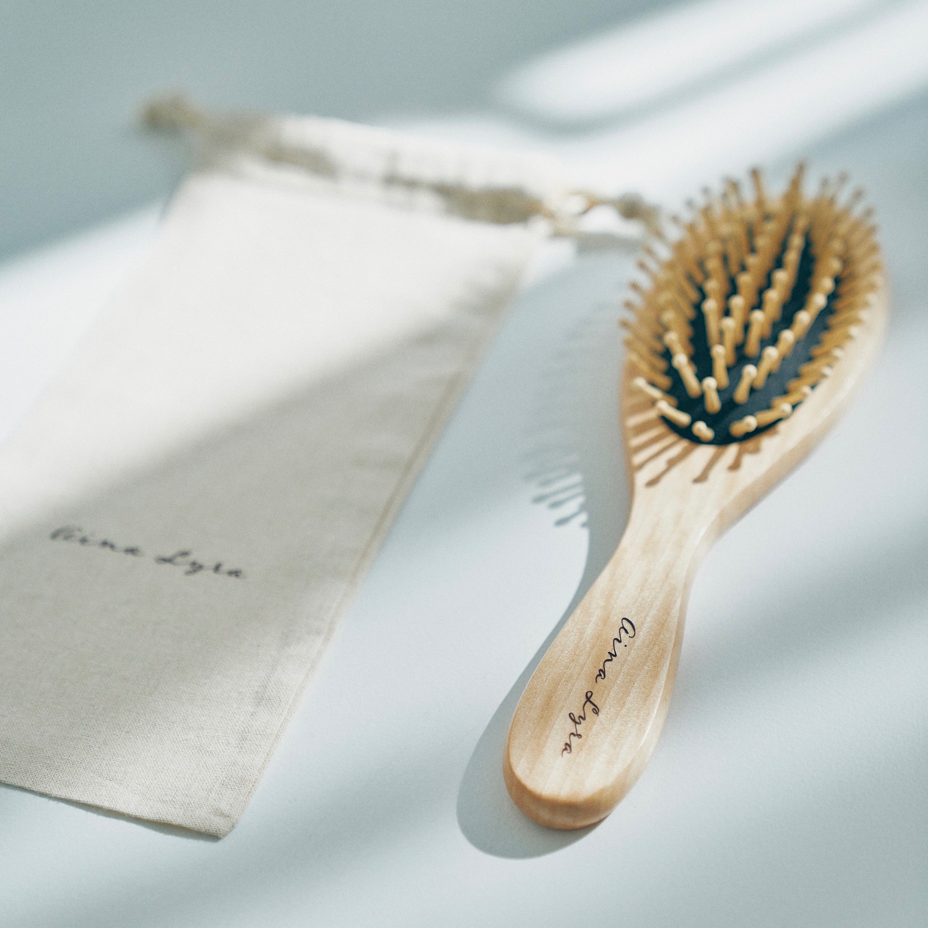 竹ピン&クッション性のある構造で、ブラッシングしながら頭皮ケアも叶うウッドヘアケアブラシ。 竹素材を使ったヘアブラシは静電気が起こりにくく軽くて丈夫。自然なツヤと頭皮の心地いいマッサージにも役立ちます。 巾着付きなので持ち運びにも便利です。 ※天然素材の為、色味・風合いに個体差が生じる場合があります。 size : 縦23cm×横6cm×高さ3.5cm